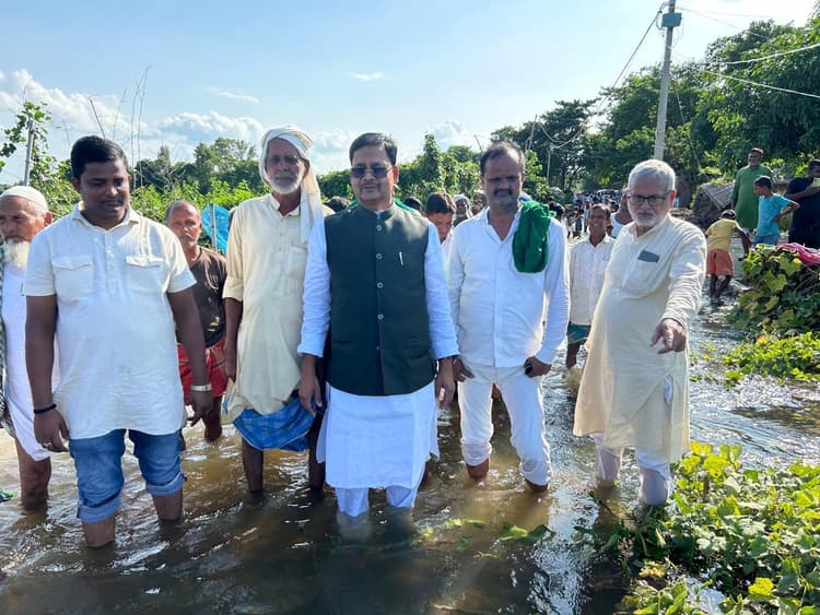 बंजरिया. सूबे के पूर्व विधि मंत्री सह स्थानीय विधायक डॉ. शमीम अहमद ने शुक्रवार को बंजरिया प्रखंड में बाढ़ ग्रस्त गांव का दौरा किया. उन्होंने नाव के सहारे क्षेत्र के सुंदरपुर, जनेरवा, जटवा, बुढ़वा, खैरी, सिसवानिया सहित अन्य गांव में पहुंचे. जहां उन्होंने पानी का जायजा लिया और पीड़ित लोगों से मुलाकात कर हर संभव मदद का भरोसा दिया. प्रशासन के द्वारा कही भी प्लास्टिक, सूखा पैकेट या अन्य कोई भी राहत साम्रगी का वितरण नहीं किया गया है, सभी जगहों पर लोग बेहाल है. कहा कि खेतों में लगे सभी फसल नष्ट हो गए हैं. बाढ़ में घिर जाने के बाद सभी लोगों का कार्य बंद है, लोग बेरोजार बैठे हैं. सरकार बाढ़ सहायता राशि 6 – 7 हजार के बदले 12 हजार रुपये सभी परिवार को अविलंब उपलब्ध कराएं. जिससे बाढ़ पीड़ित परिवारों का जीविका का संचालन हो सकें. मौके पर प्रखंड अध्यक्ष सज्जाद आलम, महेंद्र यादव, देवानंद यादव, सुरेन्द्र यादव, ताहिर हुसैन, अजमत अली, जावेद आलम, जमील अख्तर, शमीमुल हक सहित अन्य उपस्थित थे.