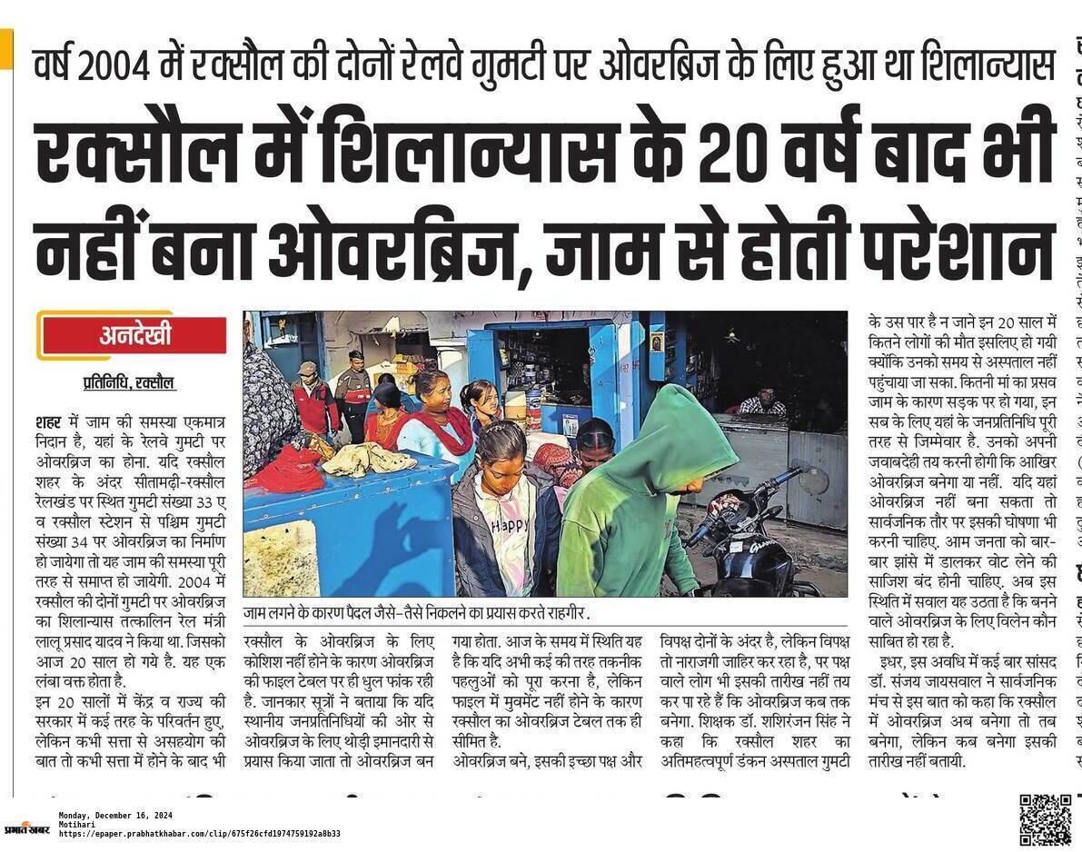 वर्ष 2004 में तत्कालीन रेल मंत्री लालू प्रसाद यादव के द्वारा शिलान्यास किये जाने के बाद से लगभग 21 साल तक इस प्रोजेक्ट पर कोई काम नहीं हुआ था. रक्सौल में ओवरब्रिज न होने से लोगों को जो परेशानी इतने सालों से हुई है, उसपर यह निर्णय मरहम का काम कर रहा है. पथ निर्माण विभाग और रेलवे के बीच आपसी सहमति कायम होने के साथ ही, अब लोगों को इस बात की उम्मीद हो गयी है कि इसका निर्माण कार्य जल्द ही शुरू होगा. यहां बता दे कि प्रभात खबर के द्वारा लगातार रक्सौल में ओवरब्रिज की समस्या को लेकर खबरों का प्रकाशन किया जाता रहा है और समय-समय पर अधिकारियों और जनप्रतिनिधियों को आइना दिखाते हुए ओवरब्रिज की मांग को लेकर मुहिम भी चलायी गयी है. जिसके प्रतिफल के स्वरूप 21 साल बाद ओवरब्रिज के निर्माण का रास्ता साफ होने से रक्सौल के नागरिकों में खुशी की लहर है. रक्सौल के साथ-साथ वीरगंज (नेपाल) व नेपाल के अलग-अलग इलाके से यहां आने वाले नेपाली नागरिकों की भी ओवरब्रिज को लेकर अक्सर शिकायतें रहती थी, जो कि इस निर्णय के बाद दूर होती दिखायी दे रही है.