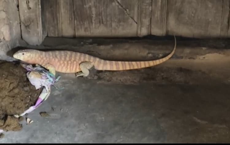 कोटवा. प्रखंड के बड़हरवा काला पूर्वी पंचायत स्थित रामजी टोला गांव में रविवार को रविन्द्र ठाकुर के घर में एक अदभुत प्रजाति का लगभग 3 फीट लंबा मॉनिटर लिजार्ड निकलने से हड़कंप मच गया. अचानक छिपकली जैसे मगरमच्छनुमा इस जीव को देखकर घर के सदस्य घबरा गए और शोर मचाने लगे. शोर सुनकर आसपास के ग्रामीण भी मौके पर जुट गए. जीव की बड़ी लंबाई और डरावनी आकृति को देखकर लोग दहशत में आ गए. गांव में इस प्रकार का जीव पहली बार देखा गया, जिससे बच्चे और महिलाएं खासे डर गए. बाद में ग्रामीणों ने सतर्कता बरतते हुए लिजार्ड को बांस की मदद से घर से बाहर निकाला गया और वह चंवर कि तरफ भाग गया. जानकारों के अनुसार यह मॉनिटर लिजार्ड संरक्षित वन्य जीवों की श्रेणी में आता है.