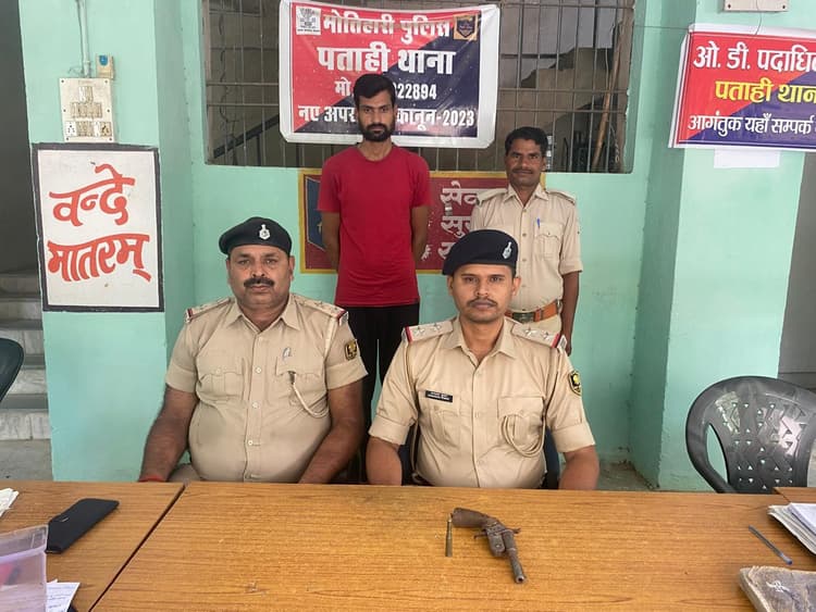 Motihari: पताही.थाना क्षेत्र के महमदी खजुरिया पुल के पास से गुरुवार रात को पुलिस छापेमारी कर एक कुख्यात अपराधी को एक देसी कट्टा एवं एक कारतूस के साथ गिरफ्तार किया है. गिरफ्तार अपराधी महमदी गांव का मिथलेश कुमार उर्फ लंबू है. थानाध्यक्ष विनीत कुमार ने बताया कि गुप्त सूचना मिला कि महमदी गांव के खजुरिया पुल के पास एक अपराधी हथियार के साथ खड़ा है . पुलिस ने त्वरित करवाई करते हुऐ छापेमारी कर उक्त कुख्यात अपराधी मिथलेश कुमार उर्फ लंबू को गिरफ्तार कर लिया, जिसे आवश्यक पूछताछ के बाद न्यायिक हिरासत में भेज दिया गया है. छापेमारी में थानाध्यक्ष के अलावा अपर थानाध्यक्ष संजय चौधरी , दारोगा अखिलेश कुमार राय, धनंजय कुमार एवं पुलिस बल शामिल थे. थानाध्यक्ष ने बताया कि गिरफ्तार अपराधी मिथलेश उर्फ लंबू का पूर्व से कई कांडों में आपराधिक इतिहास रहा है. बताया कि पताही थाना कांड संख्या 105/18 हत्या कांड , 25/ 20 लूट कांड , 106/24 लूट कांड , 312/23 मारपीट कांड में आपराधिक ईतिहास रहा है .