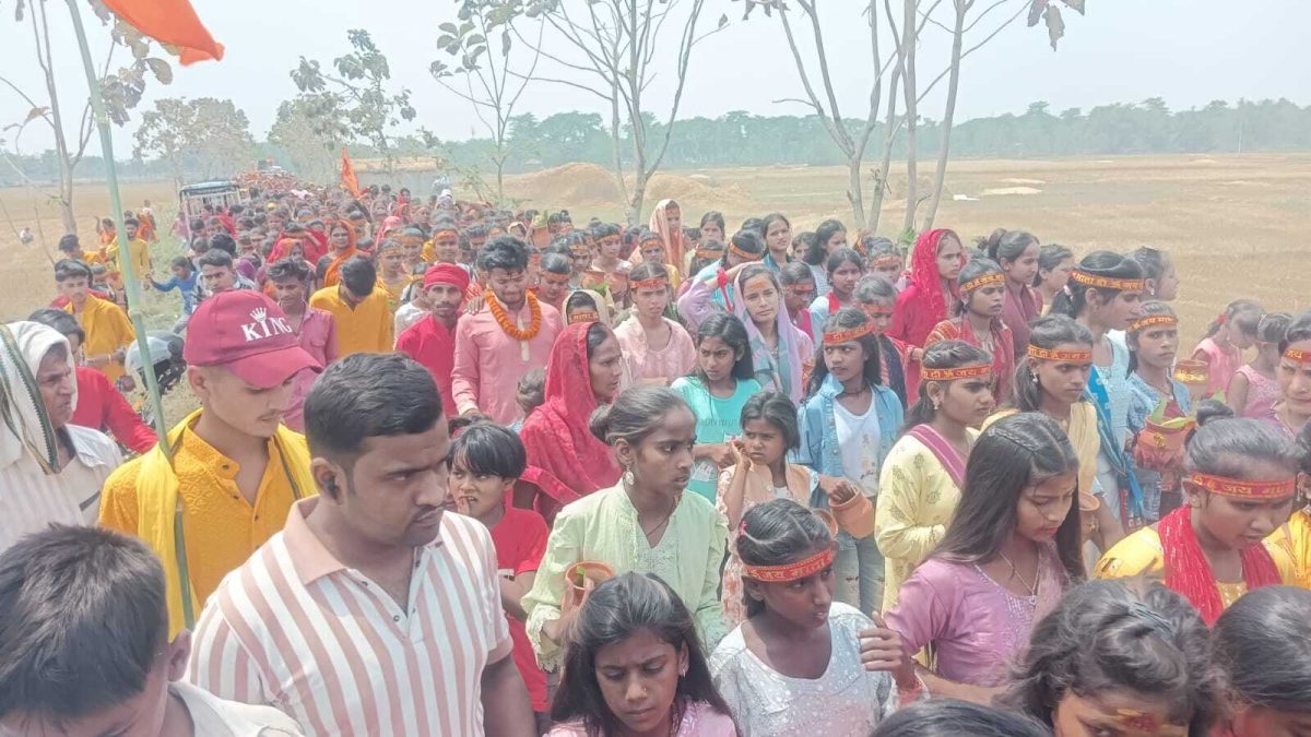 Motihari: रक्सौल . प्रखंड के भेलाही गाद नदी स्थित शनि मंदिर में स्थापित शिव मंदिर में प्राण प्रतिष्ठा को लेकर गुरूवार को 11 दिवसीय श्री रूद्र महायज्ञ को लेकर शोभा यात्रा निकाली गयीं. शोभा यात्रा पारंपरिक रीति रिवाज, गाजे-बाजे के साथ निकलीं. शोभायात्रा में 11 सौ कुंआरी कन्याओं के द्वारा अपने माथे पर कलश रखकर शोभा यात्रा निकाली गयी. शोभा यात्रा मंदिर परिसर से निकलकर भेलाही स्टेशन रोड, बाजार, नेताजी चौक, सिसवा आदि गांवों का परिभ्रमण करते हुए सिसवा तिलावे नदी के तट पर पहुंची. जहां आचार्य रौशन मिश्रा के वैदिक मंत्रोच्चारण के बीच जलबोझी किया गया. शोभा यात्रा के दौरान श्रद्धालुओं के द्वारा विभिन्न चौक-चौराहों पर कुंआरी कन्याओं के लिए अल्पहार व शरबत की व्यवस्था की गयी थी. मंदिर के महंथ बाबा रामकृष्ण दास उर्फ पप्पू बाबा ने बताया कि समाज के कल्याण के लिए समस्त ग्रामीणों के सहयोग से श्री रूद्र महायज्ञ का आयोजन किया जा रहा है जो 11 दिनों तक चलेगा. यज्ञ के दौरान मंदिर में स्थापित भगवान भोलेशंकर को प्राण प्रतिष्ठा की जाएगी. उक्त यज्ञ में वृंदावन की रामलीला व लोगों के मनोरंजन के लिए विभिन्न खेल-तमाशा को भी बुलाया गया है. मौके पर स्थानीय विधायक प्रमोद कुमार सिन्हा, जदयू नेता कपिलदेव प्रसाद उर्फ भुवन पटेल, भाजपा नेता अजय पटेल, राजद नेता रामबाबू यादव, व्यापार मंडल अध्यक्ष संजय पटेल, मुखिया रामनारायण राय, सुमन पटेल, जिला पार्षद मो. नबी हसन, डाॅ एकलाख अहमद, इंद्रजीत पटेल,,विकास पटेल, इंद्रासन साह, सुनील कुमार, राधा भगत, कृष्णा राय, गोपाल राय, विनय पटेल, पारस प्रसाद सहित हजारों की संख्या में महिला व पुरूष श्रद्धालु मौजूद थे.