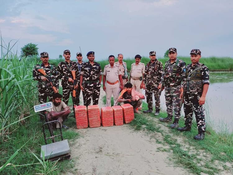 छौड़ादानो. भारत-नेपाल सीमा पर तैनात कोरैया एसएसबी और महुआवा थाना पुलिस की संयुक्त कार्रवाई में शुक्रवार की सुबह 3:45 बजे महुआवा थाना क्षेत्र के बीचला टोला कोरैया गांव के समीप से दो गांजा तस्करों को 78 किलोग्राम गांजा के साथ गिरफ्तार किया गया है. जबकि कुछ अन्य तस्कर अंधेरे का लाभ उठाते हुए भाग कर नेपाल की सीमा में प्रवेश कर गए. गिरफ्तार तस्करों की पहचान केसरिया थाना क्षेत्र के सागरचुरामन गांव निवासी 33 वर्षीय प्रमोद महतो और 23 वर्षीय निकेश महतो के रुप में हुई है. मिली जानकारी के अनुसार कोरैया एसएसबी को गुप्त सूचना मिली थी कि तस्कर नेपाल से भारी मात्रा में मादक पदार्थ लेकर आनेवाले हैं. सूचना के आलोक में एसएसबी ने महुआवा पुलिस के साथ मिल कर तस्करों के आनेवाले रास्ते पर नाकेबंदी कर दी. जैसे हीं तस्कर कच्चे रास्ते से आगे बढ़े एसएसबी और पुलिस के जवानों ने उन्हें गांजे के बंडलों के साथ धर दबोचा. मामले में एसएसबी ने सभी कागजी प्रक्रिया पूरी कर गांजा के साथ दोनों तस्करों को महुआवा थाना पुलिस को सौंप दिया है. वहीं महुआवा पुलिस ने इसकी पुष्टि करते बताया कि गिरफ्तार तस्करों के विरुद्ध मामला दर्ज कर उन्हें न्यायिक हिरासत में भेजने की तैयारी की जा रही है.
