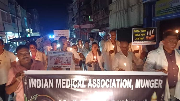 Doctor Murder Protest: कोलकाता में आरजी कर मेडिकल कॉलेज परिसर में कथित तौर पर यौन उत्पीड़न और महिला डॉक्टर की हत्या के विरोध में मंगलवार की देर शाम मुंगेर आइएमए ने कैंडल मार्च निकाला. इसमें बड़ी संख्या में शहर के चिकित्सकों ने भाग लिया. शहर के नीलम चौक स्थित आईएमए भवन से आईएमए के अध्यक्ष डॉ सुभाष चंद्रा व सचिव डॉ कुमार राहुल के नेतृत्व में कैंडल मार्च निकाला गया. जो शहर के मुख्य मार्गों का भ्रमण किया. कैंडल मार्च में शामिल चिकित्सकों ने कहा कि यह घटना देश को न सिर्फ शर्मसार किया है, बल्कि चिकित्सकों की सुरक्षा के प्रति कितनी लापरवाही है उसको भी उजागर किया है.