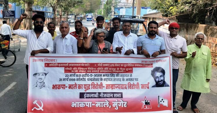 मुंगेर. भाकपा-माले व इंकलाब नौजवान सभा के संयुक्त बैनर तले मंगलवार को युद्ध विरोधी व साम्राज्यवाद विरोधी मार्च निकाला गया. जो सदर अस्पताल मोड़ से जुलूस की शक्ल में भगत सिंह चौक पर पहुंच कर समाप्त हुआ. जिसका नेतृत्व भाकपा-माले केंद्रीय कमेटी सदस्य सरोज चौबे, व्यवसायी संघ के नेता लखन कुमार, आरवाइए नेता सुमित कुमार, आईटीसी मजदूर नेता जयंत शर्मा, स्कीम वर्कर्स नेत्री गीता देवी, भीम यादव, अरुण कुमार ने संयुक्त रूप से किया. विरोध मार्च में शामिल लोग अमेरिका-इजरायल ईरान पर तत्काल हमला करना बंद करो, युद्ध नहीं शांति चाहिए, अमेरिकी साम्राज्यवाद मुर्दाबाद, मोदी सरकार चुप्पी तोड़ो, अमेरिका तेल के लिए दुनिया को तबाह करना बंद करो के नारे लगा रहे थे. वक्ताओं ने कहा कि भाकपा-माले 23 मार्च भगत सिंह की शहादत दिवस से चंद्र शेखर आजाद, श्याम नारायण यादव व भुटेली मियां की शहादत दिवस तक युद्ध विरोधी व साम्राज्यवाद विरोधी सप्ताह का आयोजन किया है. जिसके तहत यह विरोध मार्च निकाला गया. सरोज चौबे ने कहा कि अमेरिका व इजरायल ने ईरान पर तेल की लालच में एक अन्यायपूर्ण युद्ध छेड़ दिया है. जिसमें स्कूली बच्चे शहीद किये जा रहे हैं. अयातुल्ला खोमैनी के परिवार के कई सदस्य मार दिये गये. इस मानवता विरोधी युद्ध का पूरी दुनिया में विरोध हो रहा है. खुद अमेरिका में नो किंग्स का नारा लग रहा है. भारत सरकार ने गुटनिरपेक्ष नीति को तिलांजलि देते हुए अमेरिका व इजरायल के पक्ष में चुप्पी साध रखी है. इस युद्ध के खिलाफ व्यापक जनता को विरोध करना चाहिए. नेताओं ने कहा कि यु्द्ध का दुष्प्रभाव दिखने लगा है. गैस की किल्लत हो रही है. मंहगाई बढ़ रही है. फैक्टिरियां बंद हो रही हैं. मजदूर बेरोजगार हो रहे हैं.