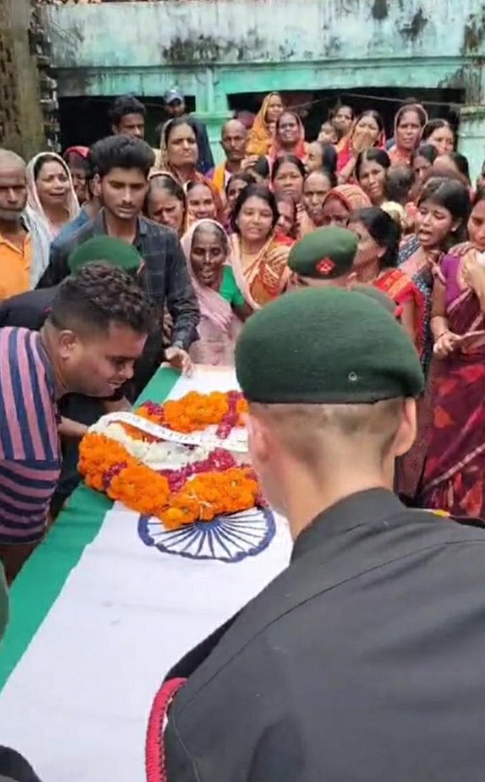 प्रतिनिधि, मुंगेर. टेटियाबंबर प्रखंड के मिल्की गांव निवासी आर्मी जवान शुभम कुमार उर्फ संगम की मौत राजस्थान के कोटा में हो गयी. जिसका शव सोमवार को मिल्की गांव पहुंचा. जवान को श्रद्धांजलि देने के लिए आसपास के क्षेत्रों से जनसैलाब उमड़ पड़ा. विधायक राजीव कुमार सिंह, गंगटा थानाध्यक्ष राहुल कुमार सहित अन्य ने गांव पहुंच कर उनके पार्थिव शरीर पर पुष्प चक्र समर्पित कर श्रद्धांजलि दी. बताया जाता है कि शुभम कुमार राजस्थान के कोटा में तैनात था. शनिवार की रात ड्यूटी के दौरान ही उसके पेट में अचानक दर्द उठा. साथी जवान उसे लेकर अस्पताल जा रहे थे, लेकिन रास्ते में उसकी मौत हो गयी. सोमवार की सुबह सेना के जवान उसे लेकर मिल्की गांव पहुंचे. शव पहुंचते ही परिवार वाले दहाड़ मार रोने-बिलखने लगे. जबकि मिल्की, बनहरा सहित आसपास के दर्जनों गांवों से हजारों की संख्या में लोग आर्मी जवान के पार्थिव शरीर का दर्शन करने पहुंचे. सभी की आंखें नम थी. इसके बाद फूलों से सजी सेना के वाहन से उसके शव को सुलतानगंज गंगा घाट पर अंत्येष्टि के लिए ले जाने के लिए निकले. शव यात्रा में शामिल सैकड़ों की संख्या में लोगों ने भारत माता की जय, जवान शुभम अमर रहे के नारे लगा रहे थे. बताया गया कि शुभम कुमार ने वर्ष 2014 में आर्मी की नौकरी ज्वाइन किया था. जो वर्तमान में राजस्थान के कोटा में पदस्थापित था. मृतक दो भाई में सबसे बड़ा था. उनके पिता निरंजन कुमार सिंह की पांच वर्ष पहले ही सड़क हादसे में मौत हो चुकी है.