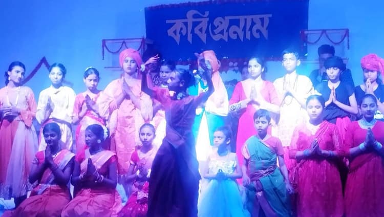 जमालपुर. स्थानीय बारोबारी तल्ला बंगाली दुर्गा स्थान परिसर में शुक्रवार की देर संध्या बंगाली बारोबारी समिति के तत्वावधान में विश्व कवि रवींद्र नाथ टैगोर की 164वीं जयंती मनायी गयी. इस अवसर पर रंगारंग सांस्कृतिक कार्यक्रम का आयोजन हुआ. कार्यक्रम की अध्यक्षता संस्था के सचिव आलोक बॉस ने की. संचालन मौसमी जोश ने किया. दीप प्रज्वलित कर कार्यक्रम का उद्घाटन गौरांग पाठशाला के सेवानिवृत प्राचार्य अजय दत्त ने किया. आरंभ में महिलाओं ने गुरु रविंद्र नाथ टैगोर द्वारा रचित रविंद्र संगीत की प्रस्तुति की. जिसमें तोमार डाक सुने जदी कियो ना आसे तवी एकला चलो रे की प्रस्तुति पर लोगों ने जमकर तालियां बजाई. इसके बाद रविंद्र संगीत की कई अन्य प्रस्तुति की गई. इसके बाद सोनार चिड़िया नामक नाटक का मंचन किया गया. कलाकारों में मानोगियां, आराध्या, नव्या, अनामिका, अदिति, अस्मिता, रिद्धि, सिद्धि, खुशबू, सोनाक्षी, तन्वी, आशीष, पूनम, सुहानी, रोशनी, प्रिया, मीठी, अमित, देवांशु मुख्य रूप से शामिल थे. कार्यक्रम के संचालन में माणिक सरकार, परितोष चौधरी, प्रह्लाद घोष, हीरक ज्योति सेन, देवदास चटर्जी और अमिताभ दास का महत्वपूर्ण योगदान रहा.