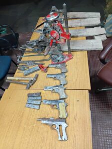 तीन निर्मित व दो अर्धनिर्मित पिस्टल सहित भारी मात्रों में अवैध हथियार बनाने का उपकरण बरामद मुंगेर. मुफस्सिल थाना क्षेत्र के गंगा पार भेलवा दियारा में एसटीएफ एवं मुंगेर पुलिस ने बुधवार की देर शाम छापेमारी कर चार मिनीगन फैक्टरी का उद्भेदन किया. जहां से एक हथियार निर्माता मो फैयाज को गिरफ्तार किया. जो मुफस्सिल थाना क्षेत्र के मिर्जापुर का रहने वाला है. मौके पर से पुलिस ने तीन निर्मित व दो अर्धनिर्मित पिस्टल, तीन जिंदा कारतूस सहित हथियार बनाने का उपकरण व अन्य समान बरामद किया. मौके पर से फरार अन्य हथियार कारोबारी की गिरफ्तारी के लिए पुलिस छापेमारी कर रही है. एसडीपीओ सदर अभिषेक आनंद ने बताया कि जानकारी मिली कि बिंद टोली भेलवा दियारा में कुछ लोग अवैध मिनीगन फैक्टरी का संचालन कर बड़े पैमाने पर हथियार का निर्माण कर रहा है. पुलिस अधीक्षक ने तत्काल उनके नेतृत्व में टीम का गठन किया. टीम में एसटीएफ एवं मुफस्सिल थाना पुलिस को शामिल किया गया. टीम नाव से गंगा पार कर बिंद टोली भेलवा दियारा पहुंची व उक्त स्थल की घेराबंदी कर छापेमारी की. इस दौरान कुछ लोग वहां के भौगोलिक स्थिति के कारण भाग निकला, लेकिन एक व्यक्ति मिर्जापुर बरदह निवासी मो फैयाज को गिरफ्तार कर लिया गया. मौके पर से पुलिस ने चार बेस मशीन, तीन निर्मित पिस्टल, दो अर्धनिर्मित पिस्टल, तीन जिंदा कारतूस, एक ड्रिल मशीन, एक हैंड बेस मशीन, एक मैगजीन सहित अन्य हथियार बनाने का उपकरण बरामद किया. इस मामले में मुफस्सिल थाना में प्राथमिकी दर्ज कर गिरफ्तार व्यक्ति को न्यायिक हिरासत में जेल भेज दिया गया. छापेमारी दल में एसडीपीओ अभिषेक आनंद, थानाध्यक्ष विपिन कुमार सिंह, पुअनि मिथलेश कुमार सहित अन्य पुलिसकर्मी शामिल थे.