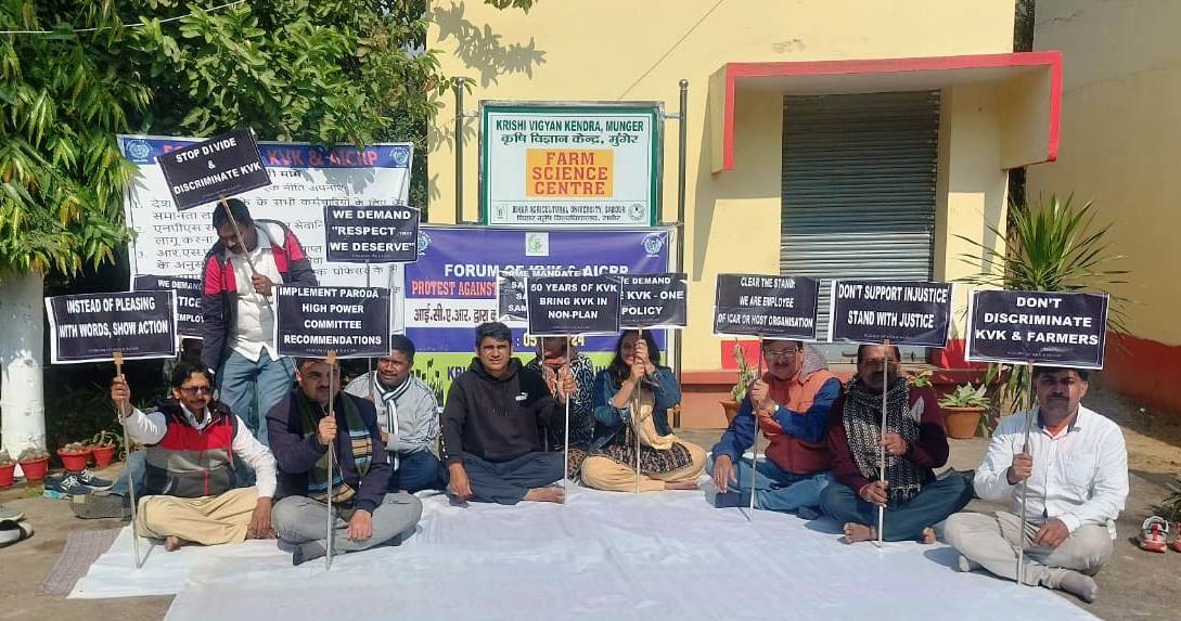 मुंगेर कृषि विज्ञान केंद्र के प्रति पक्षपातपूर्ण रवैये के खिलाफ गुरुवार कृषि विज्ञान केंद्र मुंगेर के सभी वैज्ञानिक व कर्मी एक दिवसीय कलम बंद हड़ताल पर रहे. इसके साथ ही केवीके परिसर में सभी ने धरना दिया. कलम बंद हड़ताल व धरना नेशनल फोरम ऑफ केवीके व एआइसीआरपी के आह्वान पर किया गया. कृषि विज्ञान केंद्र के वरीय वैज्ञानिक डाॅ मुकेश कुमार ने कहा कृषि विज्ञान केंद्र पूरे देश में वर्ष 1974 से भारतीय कृषि अनुसंधान परिषद नई दिल्ली, राज्य के विभिन्न कृषि विश्वविद्यालयों और कुछ प्रदेश की प्रतिष्ठित स्वयं सेवी संस्थाओं की ओर से संचालित किया जा रहा है. जो किसानों को आत्मनिर्भर बनाने में निरंतर प्रयासरत है. आज पूरे देश के प्रत्येक जिले में कृषि विज्ञान केंद्र कि स्थापना हो चुकी है. बिहार के पांच बड़े जिलों में 2-2 कृषि विज्ञान केंद्र हैं. लेकिन विडंबना है कि कृषि और किसानों के विकास, किसानों के आय दुगुनी करने की बात तो होती है, लेकिन कृषि विज्ञान केंद्र आज 50 वर्षों से अधिक समय से अपेक्षित रहते हुए योजना से गैर योजना में परिवर्तित नहीं हो पाया. इसके कारण कृषि विज्ञान केंद्र के कर्मियों को मासिक भत्ते के अलावा अन्य भत्तों एवं सुविधाओं से वंचित रहना पड़ रहा है. वहीं भारतीय कृषि अनुसंधान परिषद नई दिल्ली के द्वारा संचालित देश के लगभग 60 कृषि विज्ञान केंद्रों के कर्मियों को भारत सरकार द्वारा देय मासिक वेतन तथा अन्य सभी सुविधाएं उपलब्ध करायी जा रही है. उन्हें पेंशन, सेवानिवृत्ति,पदोन्नति और चिकित्सा भत्ता आदि का लाभ मिलता है. इसी भेदभाव पूर्ण रवैये को देखते हुए संगठन ने एक दिवसीय कलम बंद हड़ताल की.