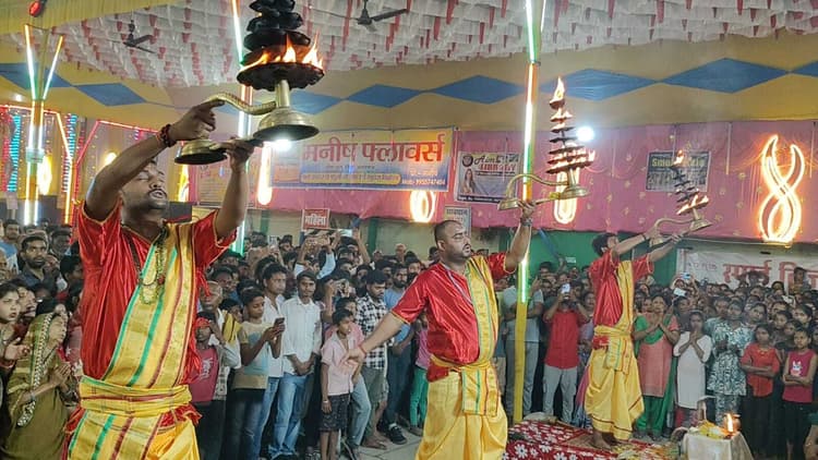 असरगंज. चैत नवरात्रि पर प्रखंड के विभिन्न चैती दुर्गा मंदिरों में शनिवार को मां दुर्गा का पट खुलते ही श्रद्धालुओं की भीड़ उमड़ पड़ी. क्षेत्र के सरस्वती स्थान दुर्गा मंदिर असरगंज, रहमतपुर चौक एवं ढोल पहाड़ी दुर्गा मंदिर में सुबह से ही महिलाओं द्वारा डलिया चढ़ाने का सिलसिला जारी रहा. वहीं शुक्रवार की देर संध्या सरस्वती दुर्गा मंदिर में बनारस आये पंडितों ने बनारस की तर्ज पर मां दुर्गा की महाआरती की. शुक्रवार की देर संध्या सरस्वती दुर्गा मंदिर असरगंज के प्रांगण में बनारस के तर्ज पर महाआरती की गयी. आरती गीत गाकर बनारस के पंडितों ने मां दुर्गा की महाआरती कर श्रद्धालु का मनमोह लिया और श्रद्धालुओं ने मां दुर्गा के जयकारे लगाये. आरती देखने के लिए मंदिर परिसर में श्रद्धालुओं की भारी भीड़ उमड़ पड़ी. मौके पर विधायक राजीव सिंह, भाजपा के पूर्व जिलाध्यक्ष प्रो. दिलीप कुमार रंजन, समिति के अध्यक्ष मुनेश्वर साह, सचिव चंदन पूर्वे, संरक्षक फंटूश राणा, मनोहर साह सहित बड़ी संख्या में श्रद्धालुओं की भीड़ लगी रही.