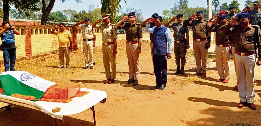 मुंगेर के शहीद जमादार संतोष कुमार सिंह को शास्त्रीनगर स्थित पुलिस लाइन में पुलिसकर्मियों ने अश्रुपूर्ण विदाई दी. मातमी धुन के बीच पुलिसकर्मियों ने शस्त्र उल्टा कर गार्ड ऑफ ऑनर दिया. जबकि मुंगेर रेंज के डीआइजी राकेश कुमार, डीएम अवनीश कुमार सिंह, एसपी सैयद इमरान मसूद ने शहीद जमादार को जहां अंतिम सलामी दी वहीं पार्थिव शरीर पर पुष्प चक्र अर्पित किया. जबकि अन्य पुलिसकर्मियों ने भी उनके पार्थिव शरीर पर पुष्प अर्पित कर अश्रुपूर्ण विदाई दी.