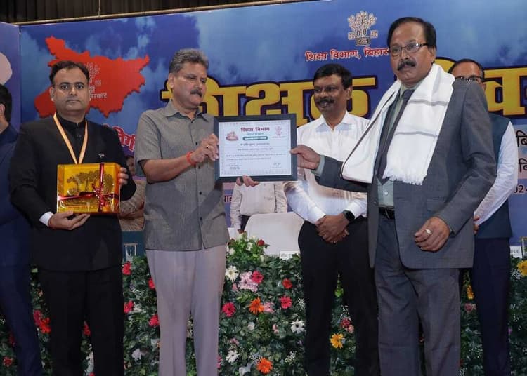 प्रतिनिधि, मुंगेर. 5 सितंबर शिक्षक दिवस पर पटना में राजकीय शिक्षक सम्मान से मुंगेर के मध्य विद्यालय कलारामपुर के प्रधानाध्यापक प्रदीप कुमार को शिक्षा मंत्री सुनील कुमार द्वारा सम्मानित किया गया. जिसे लेकर जिले के शिक्षकों में हर्ष का माहौल है. वहीं शिक्षकों ने प्रधानाध्यापक प्रदीप कुमार को बधाई दी है. बताया गया कि प्रदीप कुमार को शिक्षक दिवस पर पटना को श्रीकृष्ण मेमोरियल हॉल में शिक्षा मंत्री द्वारा राजकीय शिक्षक सम्मान 2024 से सम्मानित किया गया. उन्हें शिक्षा के क्षेत्र में बेहतर कार्य को लेकर सम्मानित किया गया. जो अपने विद्यालय मे अनुशासन बनाये रखने, शत-प्रतिशत ड्रेस कोड विद्यालय में सुनिश्चित करने, प्रतिमाह बच्चों के विकास के लिये अभिभावक बैठक करने, सप्ताह में दो बार ग्राम भ्रमण कर बच्चों को जानकारी देने, नवोदय, सैनिक स्कूल आदि में प्रवेश के लिये एक घंटे निशुल्क शिक्षा बच्चों को देने, विद्यालय को बच्चों के अनुसार शैक्षणिक माहौल देने, विद्यालय में बेहतर र्स्माट क्लास संचालन आदि के लिये सम्मानित किया गया. प्रदीप कुमार को इससे पहले भी साल 2023 में एससीईआरटी के निदेशक सज्जन कुमार द्वारा प्रज्ञा अवार्ड से सम्मानित किया गया था. जबकि साल 2006 में खड़गपुर के प्रखंड शिक्षा पदाधिकारी, 2011, 2020 तथा 2022 में डीईओ और साल 2022 में 73 वें गणतंत्र दिवस पर डीएम के हाथों प्रधानाध्यापक प्रदीप कुमार सम्मानित हो चुके हैं.