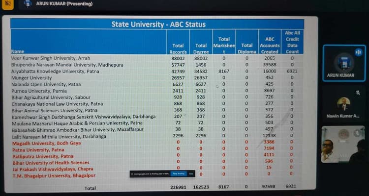 एमयू ने अपने स्नातक के दो सत्रों के 26,957 विद्यार्थियों का सर्टिफिकेट किया अपलोड, प्रतिनिधि, मुंगेर. यूजीसी के गाइडलाइन के अनुसार मुंगेर विश्वविद्यालय द्वारा अकादमिक बैंक ऑफ क्रेडिट (एबीसी) को लेकर अपने विद्यार्थियों के सर्टिफिकेट व अन्य दस्तावेजों को डिजी लॉकर पर ऑनलाइन करने की प्रक्रिया शुरू कर दी गयी है. जिसमें मुंगेर विश्वविद्यालय जहां सूबे के सभी पारंपरिक विश्वविद्यालयों में तीसरे स्थान पर है. वहीं तकनीकी विश्वविद्यालयों को मिलाकर भी मुंगेर विश्वविद्यालय सूबे में चौथे स्थान पर है. एमयू के अकादमिक बैंक ऑफ क्रेडिट (एबीसी) के नोडल अधिकारी डॉ सूरज कोनार ने बताया कि मंगलवार को उच्च शिक्षा विभाग द्वारा एबीसी को लेकर ऑनलाइन समीक्षा बैठक की गयी थी. जिसमें अकादमिक बैंक ऑफ क्रेडिट के क्रियान्वयन की समीक्षा की गयी. इस बैठक में एमयू के कुलसचिव कर्नल विजय कुमार ठाकुर भी शामिल थे. इसमें बताया गया कि एबीसी के संचालन में सूबे के पारंपरिक विश्वविद्यालयों में मुंगेर विश्वविद्यालय तीसरे स्थान पर है. उन्होंने बताया कि विश्वविद्यालय द्वारा अबतक सत्र 2018-21 तथा सत्र 2019-22 स्नातक के दो सत्रों में कुल 26,957 विद्यार्थियों के सर्टिफिकेट को अकादमिक बैंक ऑफ क्रेडिट (एबीसी) के माध्यम से डिजी लॉकर पर अपलोड कर दिया गया है. जबकि विश्वविद्यालय में उक्त सत्र के कुल 600 विद्यार्थियों का डिजी लॉकर पर एबीसी अकाउंट भी बना दिया गया है. उन्होंने बताया कि पीजी के सत्र 2018-20 के दौरान ऑनलाइन प्रक्रिया संचालित नहीं होने के कारण कुछ तकनीकी परेशानी है. जिसे जल्द ही दूर कर पीजी के सत्रों के विद्यार्थियों के सर्टिफिकेट को भी एबीसी पर अपलोड कर दिया जायेगा.