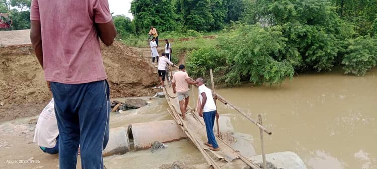 हवेली खड़गपुर. पिछले कई दिनों से हो रही मूसलाधार बारिश से गंगा नदी उफान पर है. हवेली खड़गपुर-तारापुर मुख्य मार्ग में बने तीन डायवर्सन नदी की तेज उफान में क्षतिग्रस्त हो गया है. इससे खड़गपुर-तारापुर मार्ग में यातायात ठप हो गया है. डायवर्सन पर लोहे का पाइप व चदरा डालकर लोग अपनी जान जोखिम में डालकर डायवर्सन से आवागमण कर रहे हैं. मालूम हो कि बीते जुलाई माह में भी बारिश होने से खड़गपुर-तारापुर मुख्य मार्ग में तीन स्थानों पर बने डायवर्सन क्षतिग्रस्त हो गये था. इससे लगभग 10 दिनों तक आवागमन प्रभावित रहा. अगस्त माह के शुरुआती दिनों में भी मूसलाधार बारिश हुई. पिछले एक सप्ताह से खड़गपुर-तारापुर मुख्य मार्ग में वाहनों का परिचालन ठप है. ऐसी परिस्थिति में चार पहिया व बाइक चालकों को घुमावदार रास्ते का प्रयोग कर खड़गपुर व तारापुर जाना पड़ता है. नगर परिषद के डंगरी नदी स्थित डायवर्सन के नदी की धार में बह जाने के बाद कैथी, महकोला, तुलसीपुर, धपरी, ताजपुर समेत विभिन्न ग्रामीण क्षेत्रों की छात्र-छात्राएं, दैनिक मजदूर, कामगार, दैनिक कर्मचारी और ग्रामीण डंगरी नदी में लोहे के पाइप और टिन का चदरा बिछा कर आवश्यक काम को लेकर आवाजाही कर रहे है. छात्र-छात्राएं इसी पतले पाइप को पकड़ कर नदी की धार के बीच से विद्यालय, महाविद्यालय, कोचिंग संस्थान पहुंच रही है. यूं कहें कि लोग अपनी जान जोखिम में डालकर नदी को पार कर रहे हैं. जिससे कभी भी हादसा हो सकता है.