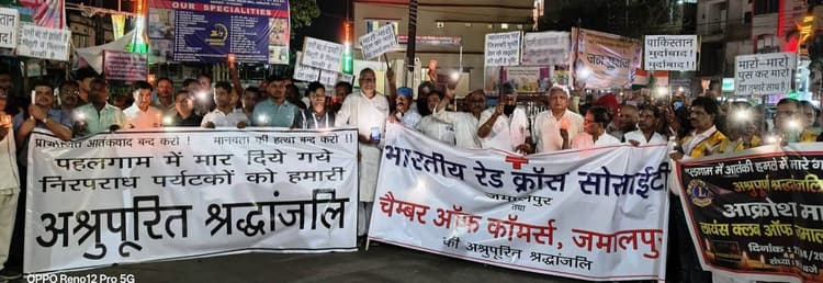 जमालपुर. पहलगाम आतंकी हमला को लेकर विरोध प्रदर्शन थमने का नाम नहीं ले रही है. भारतीय रेडक्रॉस सोसाइटी व चैंबर ऑफ कॉमर्स जमालपुर की ओर से रविवार को संयुक्त रूप से तो अंजुमन इत्तेहादे मिल्लत ने कैंडल मार्च निकाल कर आतंकी हमले में मृत पर्यटकों को श्रद्धांजलि दी. साथ ही आतंकवाद और पाकिस्तान के खिलाफ जमकर नारेबाजी कर अपना विरोध दर्ज कराया.कैंडल मार्च निकाल पाकिस्तान मुर्दाबाद के लगाये नारे
