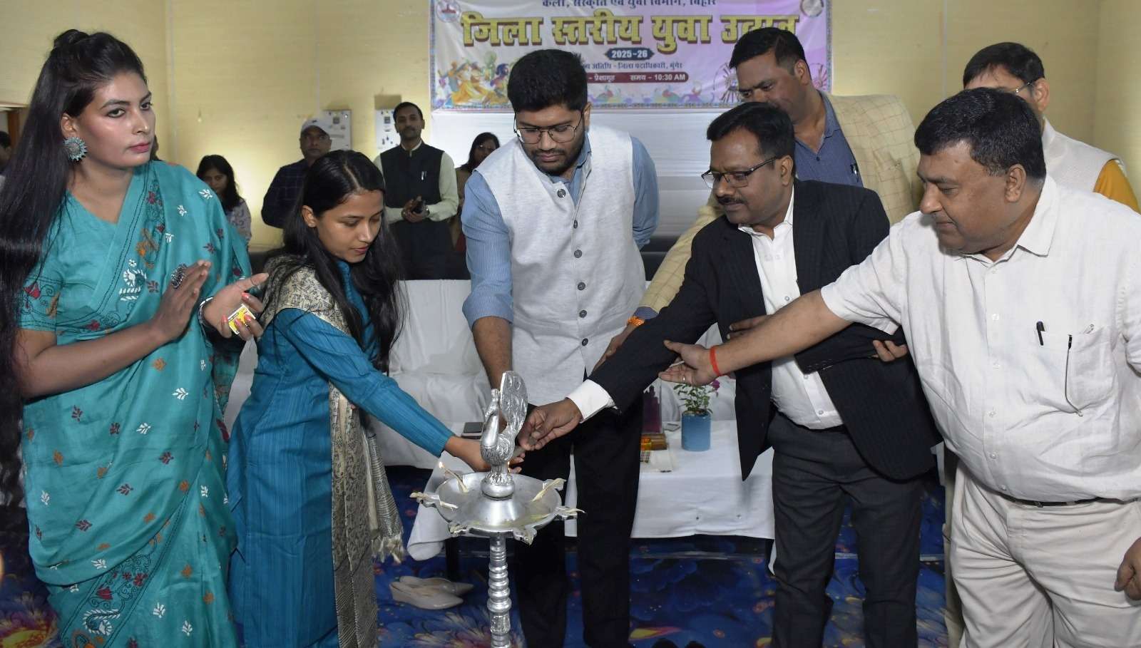 मुंगेर. प्रेक्षागृह में गुरुवार को जिलास्तरीय युवा उत्सव कार्यक्रम का आयोजन किया गया. इसका उद्घाटन डीएम निखिल धनराज ने दीप प्रज्वलित कर किया. कार्यक्रम की शुरूआत राष्ट्रगान के साथ हुई. इसके बाद युवा कलाकारों ने नृत्य, साहित्य से लेकर विभिन्न विधाओं में अपना हुनर दिखाया. मौके पर नगर आयुक्त शिवाक्षी दीक्षित, उप विकास आयुक्त अजीत कुमार सिंह सहित अन्य मौजूद थे.डीएम ने कहा कि गुरुवार को जिले में जिलास्तरीय युवा उत्सव कार्यक्रम का आयोजन किया गया है. इसमें जिले भर के युवा कलाकारों को अपनी कला के प्रदर्शन का मौका मिला है. कार्यक्रम में विभिन्न विधाओं में कई प्रतिभागी भाग लेंगे और कोई सफल होंगे तो कोई असफल. जीत-हार हर खेल और विधा का नियम है, इसलिए आप सभी यह कभी भी न सोचें कि आप जीत रहे हैं या हार रहे हैं. हर कार्यक्रम अथवा खेल को भावनात्मक रूप से लें और जीत हार की परवाह किये बगैर अपनी बेहतर प्रतिभा का प्रदर्शन करें. उन्होंने सभी कलाकारों से कहा कि मुंगेर जिला प्रशासन आप सभी कलाकारों से अपेक्षा रखता है कि आप इस कार्यक्रम में अपना बेहतर प्रदर्शन करें और जिला से राज्य एवं राष्ट्र स्तर पर पहुंच कर मुंगेर का नाम और मान बढ़ाएं. पहले दिन कलाकारों ने समूह लोक नृत्य और समूह लोक गायन में जहां अपनी प्रतिभा का बेहतरीन प्रदर्शन किया. वहीं चित्रकला, कहानी एवं कविता लेखन, वक्तृता, विज्ञान प्रदर्शनी में युवाओं ने अपना हुनर दिखाया. प्रतिभागियों ने बेहतर और मनमोहक प्रदर्शन किया. सभी सफल प्रतिभागियों को मोमेंटो एवं प्रशस्ति पत्र देकर सम्मानित किया गया. मौके पर जिला भू-अर्जन पदाधिकारी पंकज कुमार गुप्ता, डीटीओ सुरेंद्र कुमार अलबेला, डीईओ कुणाल गौरव, जिला कला एवं संस्कृति पदाधिकारी सुकन्या मौजूद थी.