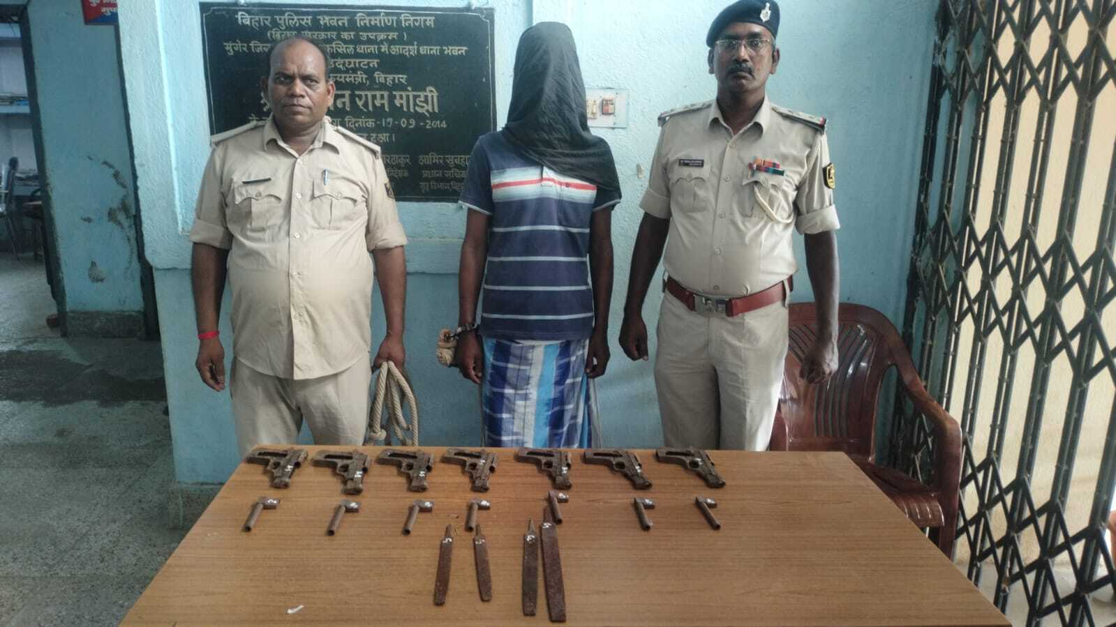 मुंगेर. मुफस्सिल थाना पुलिस ने शनिवार को मिर्जापुर बरदह गांव में छापेमारी कर भारी मात्रा में अर्धनिर्मित हथियार बरामद किया है. जबकि तस्कर मो. अरमान को भी गिरफ्तार किया है. जिसे न्यायिक हिरासत में जेल भेज दिया गया. बताया जाता है कि मुफस्सिल थानाध्यक्ष विपिन कुमार सिंह को सूचना मिली कि मिर्जापुर बरदह निवासी मो. अरमान हथियार निर्माण के साथ ही कारोबार करता है. जो अपने घर में भारी मात्रा में निर्मित व अर्धनिर्मित हथियार भंडारण कर रखा है. पुलिस ने उसके घर पर छापेमारी कर 7 अर्धनिर्मित पिस्तौल के साथ ही 7 अर्धनिर्मित बैरल बरामद किया. जिसके बाद पुलिस गिरफ्तार तस्कर व बरामद हथियार को लेकर थाना पहुंची. थानाध्यक्ष विपिन कुमार सिंह ने बताया कि गिरफ्तार मो अरमान के विरूद्ध थाने में आर्म्स एक्ट के तहत प्राथमिकी दर्ज कर शनिवार को न्यायिक हिरासत में जेल भेज दिया गया. अब तक के अनुसंधान में इस बात की पुष्टि हुई है कि मो अरमान बहुत दिनों से हथियार की खरीद बिक्री के कारोबार से जुड़ा था.