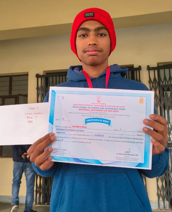 बड़हिया. नेशनल मैथमेटिक्स डे पर आयोजित राज्यस्तरीय गणित प्रतिभा परीक्षा में आर्यभट्ट प्रगति स्कूल, प्रतापपुर के विद्यार्थियों ने उत्कृष्ट प्रदर्शन कर जिले का नाम रोशन किया. बिहार सरकार द्वारा प्रतिवर्ष नेशनल मैथमेटिक्स डे पर कक्षा छठी से 12वीं तक के प्रतिभाशाली छात्रों के चयन के लिए 100 अंकों की गणित परीक्षा आयोजित की जाती है, जिसमें निगेटिव मार्किंग का भी प्रावधान रहता है. इस वर्ष यह परीक्षा 29 नवंबर 2025 को संपन्न हुई थी. इसमें सूबे के करीब एक लाख विद्यार्थियों ने भाग लिया. इस कड़ी प्रतिस्पर्धा में आर्यभट्ट प्रगति स्कूल प्रतापपुर के छात्रों ने उल्लेखनीय सफलता हासिल की. कक्षा सप्तम के छात्र प्रिंस कुमार ने जिले में प्रथम स्थान प्राप्त कर शीर्ष स्थान हासिल किया. जबकि इसी विद्यालय के छात्र सचिन कुमार ने तृतीय स्थान प्राप्त कर विद्यालय को गौरवान्वित किया. सफल विद्यार्थियों को पटना स्थित ज्ञान भवन में आयोजित सम्मान समारोह के दौरान विज्ञान, प्रौद्योगिकी एवं तकनीकी शिक्षा विभाग, बिहार सरकार के मंत्री सुनील कुमार द्वारा मेडल, प्रशस्ति पत्र व नगद पुरस्कार से सम्मानित किया गया. जिला स्तर पर मिली इस उपलब्धि से न केवल आर्यभट्ट प्रगति स्कूल प्रतापपुर का नाम रोशन हुआ है, बल्कि छात्रों के परिवार, गांव व पूरे प्रखंड को भी गौरव की अनुभूति हुई है. विद्यालय के संस्थापक विकास कुमार ने छात्रों की सफलता पर प्रसन्नता व्यक्त करते हुए कहा कि यह उपलब्धि केवल विद्यालय के लिए ही नहीं, बल्कि समस्त शिक्षा प्रेमियों के लिए गर्व का विषय है. उन्होंने विद्यार्थियों को उज्ज्वल भविष्य के लिए शुभकामनाएं दी.