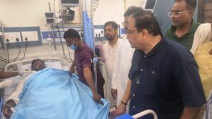 – अनशनकारी राजद नेता मुकेश यादव से मिलने पहुंचे सांसद मनोज झा मुंगेर ————————- बाढ़ पीड़ितों को राहत व सहायता राशी दिलाने के लिए बरियारपुर प्रखंड कार्यालय के समीप अनशन पर बैठे राजद नेता अविनाश कुमार विद्यार्थी उर्फ मुकेश यादव की चौथे दिन तबीयत काफी बिगड़ गयी. जिसे एंबुलेंस से बरियारपुर से मुंगेर लाया गया और एक निजी नर्सिंग होम में भर्ती कराया गया. इधर तबीयत बिगड़ने की सूचना पर राज्यसभा सांसद सह राजद के वरीय नेता मनोज कुमार झा निजी नर्सिंग होम पहुंच कर मुकेश यादव से मुलाकात की और हाल-चाल जाना. बरियारपुर प्रखंड कार्यालय के समीप मंदिर परिसर में अनशन पर बैठे राजद नेता की गुरुवार को तबीयत बिगड़ गयी. प्राथमिक स्वास्थ्य केंद्र के चिकित्सक ने अनशन स्थल पर पहुंच कर उनका इलाज किया और स्लाइन लगाया. उनका ब्लड प्रेशर काफी लो हो गया था. जिसके कारण चिकित्सकों ने उसे बेहतर इलाज की जरूरत बताया. जिसके बाद एंबुलेंस से मुंगेर लाया गया और निजी नर्सिंग होम में भर्ती कराया. जहां उनका इलाज चल रहा है. वे खतरे से बाहर बताये जा रहे है. इधर अनशन स्थल पर बरियारपुर जा रहे राज्यसभा सांसद मनोज कुमार झा को जब पता चला कि अनशनकारी राजद नेता को निजी नर्सिंग होम में भर्ती कराया तो उनसे मिलने वे नर्सिंग होम पहुंच गये. मुकेश यादव हौसला बढ़ाते हुए सांसद मनोज झा ने कहा कि पूरे बिहार में भ्रष्टाचार का आलम इस कदर व्याप्त है कि आम आदमी की छोड़िए जनप्रतिनिधियों की भी कोई बात नहीं सुन रहा है. बाढ़ रिलीफ के नाम पर लूट मची हुई है. मुंगेर जिला प्रशासन अविलंब बाढ़ पीड़ित लोगों को मुआवजा राशि दे, नहीं तो राजद के लोग बाध्य होकर सड़कों पर प्रदर्शन करेगें. मौके पर राजद नेता प्रभात कुमार पीयूष, गजेंद्र कुमार हिमांशु, संजय पासवान, शिशिर कुमार लालू, आदर्श राजा, मनीष कुमार सहित दर्जनों राजद नेता मौजूद थे. इधर मुकेश यादव के नर्सिंग होम में भर्ती होने के बाद उनके साथ अनशन पर बैठे राजद के पूर्व जिलाध्यक्ष देवकीनंदन सिंह एवं राजाराम गुप्ता का अनशन जूस पिला कर राजद नेताओं ने तुड़वाया. राजद बुद्धिजीवी प्रकोष्ठ के प्रदेश महासचिव विनय कुमार सुमन एवं मुंगेर नगर निगम के डिप्टी मेयर खालिद हुसैन, नरेश सिंह यादव ने राजद नेताओं के साथ अनशन पहुंच कर अनशन पर बैठे दोनों नेताओं को जूस पिला कर अनशन समाप्त कराया.