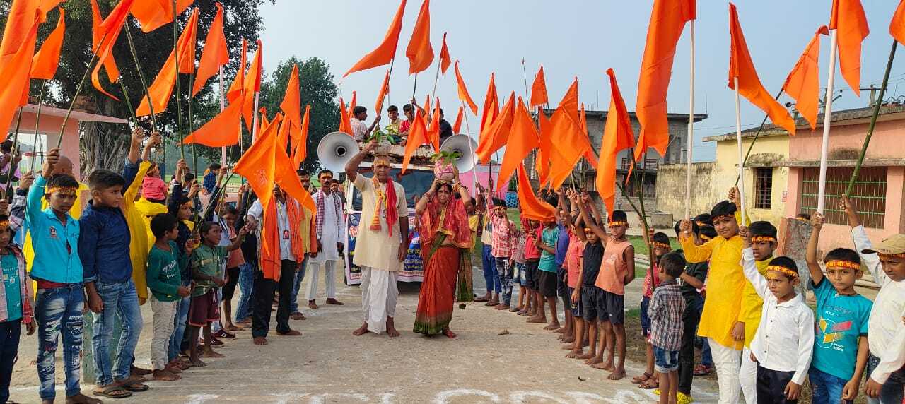 हवेली खड़गपुर/ संग्रामपुर. शारदीय नवरात्र के पहले दिन कलश स्थापन कर मां दुर्गा के प्रथम स्वरूप की पूजा-अर्चना की गयी. पहली पूजा को जिले के विभिन्न दुर्गा मंदिरों में श्रद्धालुओं की भीड़ उमड़ पड़ी. दुर्गा मंदिरों में दुर्गा सप्तशती का पाठ भी आरंभ हो गया. मंदिरों में भक्ति गीत से माहौल भक्तिमय हो उठा है. — हवेली खड़गपुर. शारदीय नवरात्र को लेकर विशेष धार्मिक अनुष्ठान सोमवार से प्रारंभ हो गया. वैदिक मंत्रोच्चारण के बीच प्रखंड के शहरी एवं ग्रामीण दुर्गा मंदिरों व घरों में लोगों ने निष्ठा भाव के साथ कलश की स्थापना की और मां दुर्गा के प्रथम स्वरूप मां शैलपुत्री की पूजा-अर्चना की. साथ ही श्रद्धालुओं ने नौ दिनों तक व्रत करने का संकल्प लिया. मुलुकटांड़ बड़ी काली मंदिर, बड़ी दुर्गा मंदिर, विषहरी स्थान, कुलकुला स्थान, हाड़ीवा काली मंदिर, सिंहपुर, सितुहार, हाट चौक, तेघड़ा, समदा, फसियाबाद, पहाड़पुर, धपरी, लोहची, शामपुर, प्रसंडो सहित विभिन्न दुर्गा मंदिरों में भक्ति भाव के साथ पूजा-अर्चना की गई और कलश की स्थापना पारंपरिक तरीके से की गई. इधर तेघड़ा दुर्गा मंदिर समिति की ओर से भव्य कलश शोभा यात्रा निकाली गयी. — संग्रामपुर. शक्ति उपासना का महापर्व शारदीय नवरात्र के पहले दिन श्रद्धालुओं ने घरों और मंदिरों में कलश स्थापना कर मां दुर्गा का आह्वान किया. भक्तों ने सुख, शांति और समृद्धि की कामना के साथ मां शैलपुत्री की पूजा-अर्चना की. क्षेत्र के मंदिरों में आकर्षक सजावट करने का दौर जारी है और मंदिरों में बज रहे भक्ति गीतों से वातावरण भक्तिमय बना हुआ है. वहीं कलाकार मां दुर्गा की प्रतिमा अंतिम रूप में देने के लिए दिन-रात मेहनत कर रहे हैं. ——————————————————– कमरांय दुर्गा मंदिर में छाती पर कलश स्थापित कर विश्वजीत कर रहा मां की आराधना असरगंज. भागलपुर-मुंगेर जिले के सीमा पर स्थित कमराय दुर्गा मंदिर में भक्ति का अनोखा दृश्य देखने को मिल रहा है. जहां बांका जिला के चटमाडीह गांव निवासी विश्वजीत सिंह अपने सीने पर कलश रखकर मां की भक्ति कर रहा है. उसकी यह भक्ति तीसरे वर्ष से निरंतर जारी है. नवरात्रि के प्रथम पूजा के दिन पंडित मुकेश कुमार झा ने वैदिक मंत्रोच्चार के साथ 32 वर्षीय विश्वजीत कुमार सिंह के सीने पर कलश स्थापित कराया. विश्वजीत की कठोर साधना को देखने के लिए आसपास के गांव सहित अन्य जगहों के लोग पहुंच रहे हैं, जो आस्था का केंद्र बना हुआ है. वही विश्वजीत की पत्नी अवंतिका देवी ने कहा कि पूरे नौ दिनों तक वे किसी भी प्रकार का आहार नहीं लेंगे. केवल चेहरा को तुलसी और गंगाजल से पोछा जायेगा. साधना करने से पहले ही विश्वजीत द्वारा अभ्यास किया जाता है. जिसके बाद वह अपनी साधना पर मंदिर में कलश स्थापित करवाते हैं. —————