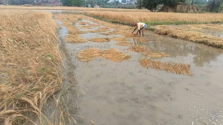 खेतों में पानी भर जाने के कारण गिर गयी गेहूं की बालियां