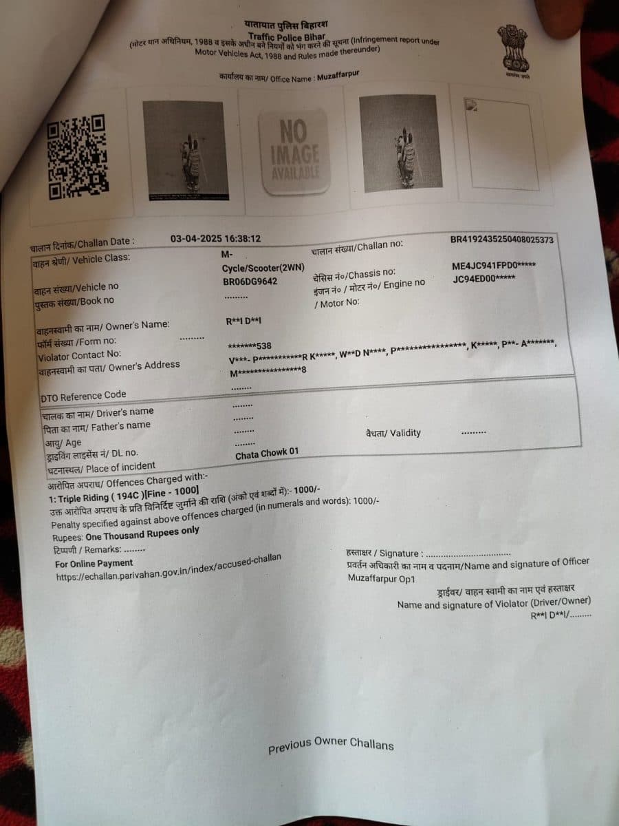 Bihar News: बिहार के मुजफ्फरपुर में एक बाइक का ट्रिपल लोडिंग की वजह से चालान कट गया. हैरानी की बात तब हुई जब वाहन मालिक थाने में पहुंचकर शिकायत की कि मेरी बाइक घर पर खड़ी थी. इसके बावजूद चालान कैसे हुआ? पढ़ें पूरी खबर…