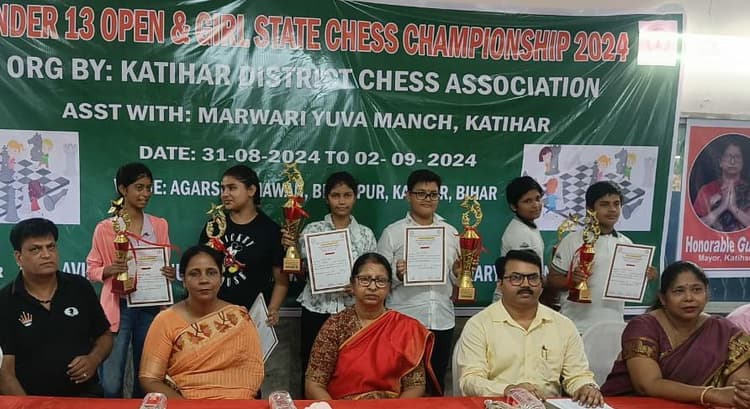 अखिल बिहार शतरंज संघ के तत्वावधान में कटिहार जिला शतरंज संघ द्वारा आयोजित बिहार राज्य अंडर-13 शतरंज प्रतियोगिता मुजफ्फरपुर के तेजस शांडिल्य ( बालक वर्ग) व भोजपुर की अर्पिता सिंह (बालिका वर्ग) ने जीत ली. अंतिम चक्र के मुकाबले में तेजस ने प्रत्यूष के साथ बाजी ड्रा खेलकर जबकि अर्पिता ने पूर्णिया की चारवी बैद को पराजित कर प्रतियोगिता अपने नाम की. बालक वर्ग में हुए कांटे के मुकाबले में अंतिम चक्र के बाद पांच खिलाड़ी छह अंकों के साथ शीर्ष स्थान पर आये. इनके बीच टाई ब्रेक अंकों के आधार अंतिम परिणाम घोषित किये गये. बेहतर बुखोल्ज के आधार पर हुए निर्णय में मुजफ्फरपुर के तेजस शांडिल्य को विजेता जबकि दरभंगा के जयेश मिश्रा को उपविजेता घोषित किया गया. वहीं बालिका वर्ग में भी इस बार बिहार शतरंज की तस्वीर बदली हुई दिखी. एक समय तक पटना के दबदबा रहनेवाले इस खेल में इस बार बालक एवं बालिका दोनों वर्गों में पटना के एक भी खिलाड़ी राष्ट्रीय प्रतियोगिता के लिये चयनित नहीं हो सके. बालिका वर्ग में पांच रेटेड खिलाड़ियों की उपस्थिति के बीच भोजपुर की अनरेटेड खिलाड़ी अर्पिता सिंह ने साढ़े पांच अंको के साथ प्रतियोगिता जीत ली. बालिका वर्ग में हुए मुकाबले में शीर्ष बोर्ड पर खेलते हुए मुजफ्फरपुर की आद्या श्री ने किशनगंज की पलछिन जैन को जबकि दो नम्बर बोर्ड पर भोजपुर की अर्पिता ने पूर्णिया की चारवी बैद को परास्त कर साढ़े पांच अंक अर्जित किये. अर्पिता एवं आद्या के बीच बुखोल्ज अंकों के आधार पर हुए निर्णय में अर्पिता को विजेता जबकि आद्या को उपविजेता घोषित किया गया.अंतिम चक्र की समाप्ति के उपरांत सम्पन्न पुरस्कार वितरण सामारोह में उपस्थित मुख्य अतिथि उषा अग्रवाल , शहर की प्रख्यात महिला चिकित्सक डॉ नूतन कुमारी , सम्मानित अतिथि शिप्रा सिंह , अखिल बिहार शतरंज संघ के संयुक्त सचिव सह मुख्य निर्णायक नंदकिशोर एवं कटिहार जिला शतरंज संघ के उपाध्यक्ष डॉ शम्भुनाथ एवं आयोजन सचिव प्रत्युष कुमार ने विजेता खिलाडियों को ट्रॉफी एव प्रमाणपत्र देकर सम्मानित किया .प्रतियोगिता में प्रथम दस स्थानों पर आनेवाले खिलाड़ियों की सूची इस प्रकार है :बालक वर्ग1 तेजस शांडिल्य, मुजफ्फरपुर-6 अंक2 जयेश मिश्र,दरभंगा 6 अंक3 प्रत्यूष कुमार,पटना 6 अंक4 अव्यय शर्मा पटना 6 अंक5 यथार्थ नाथानी, मुजफ्फरपुर 6 अंक