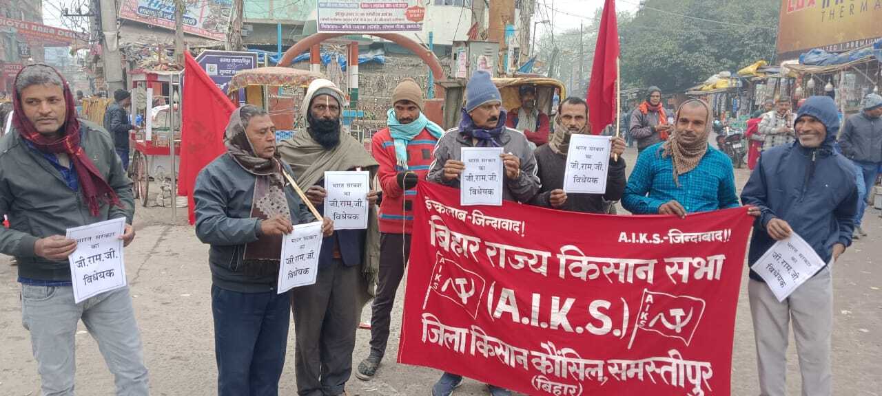 Samastipur News:समस्तीपुर : बिहार राज्य किसान सभा समस्तीपुर जिला किसान कौंसिल की ओर से जी राम जी विधेयक के खिलाफ विरोध प्रदर्शन किया गया. समस्तीपुर स्टेशन चौक गांधी स्मारक स्थल पर विधेयक की प्रतियां जलाई गई. इस अवसर पर उपेन्द्र राय की अध्यक्षता में सभा हुई. जिला मंत्री सत्यनारायण सिंह ने कहा केंद्र सरकार बड़े पूंजीपति के पक्षधर व किसान मजदूर विरोधी है. अपने शासनकाल में धार्मिक आधार पर सिर्फ नाम बदलने पर उतारू है. मनरेगा कानून 2005 में माकपा सहित वामपंथियों के संघर्ष के परिणाम स्वरूप मजदूरों के रोजगार के कानून बनाया गया था. इसको सरकार समाप्त करने की योजना बना रही है. जी राम जी विधेयक संशोधन पर घोर निंदा करते हुए अविलंब वापस लेने की मांग की. मौके पर अनिल कुमार राय, गणेश महतो, राकेश पासवान, सत्यनारायण पासवान, बिगन कुमार, सुनील कुमार आदि थे.