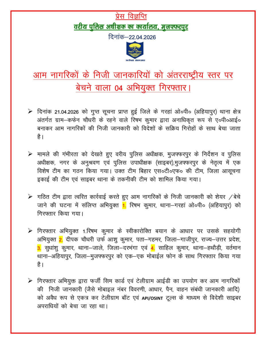 एसएसपी कांतेश कुमार मिश्रा की तरफ से दी गयी जानकारी के अनुसार, 21 अप्रैल 2026 को गुप्त सूचना के आधार पर अहियापुर थाना क्षेत्र के गरहा ओपी इलाके में कार्रवाई की गई. सूचना मिली थी कि कफेन चौधरी निवासी रिशम कुमार अवैध तरीके से एपीआई बनाकर आम लोगों की निजी जानकारी विदेशों में सक्रिय गिरोहों को बेच रहा है. मामले की गंभीरता को देखते हुए एसएसपी के निर्देश पर एक विशेष टीम का गठन किया गया, जिसमें बिहार एसटीएफ, जिला आसूचना इकाई और साइबर थाना की टीम शामिल थी.