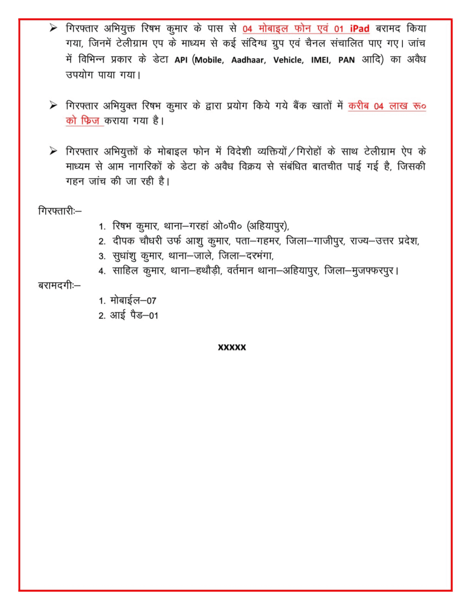 मुख्य आरोपी रिशम कुमार के पास से 4 मोबाइल फोन और 1 आईपैड बरामद किया गया है. इन डिवाइसों में टेलीग्राम के जरिए कई संदिग्ध ग्रुप और चैनल संचालित होने के साक्ष्य मिले हैं. इसके अलावा विभिन्न प्रकार के डेटा API का अवैध उपयोग भी सामने आया है. पुलिस जांच में यह भी खुलासा हुआ है कि आरोपियों के बैंक खातों में करीब 4 लाख रुपये का संदिग्ध लेनदेन हुआ है, जिसे फ्रीज कर दिया गया है. वहीं, आरोपियों के मोबाइल फोन में विदेशी गिरोहों के साथ डेटा खरीद-बिक्री से जुड़ी बातचीत भी मिली है, जिसकी गहन जांच जारी है.