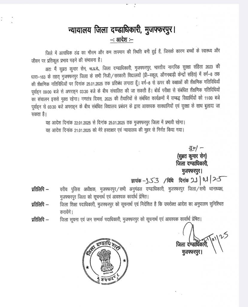 Muzaffarpur News: बढ़ते ठंड के बीच फिर बजी स्कूलों में छुट्टी की घंटी, 25 जनवरी तक 1 से 8 तक के सभी स्कूल बंद