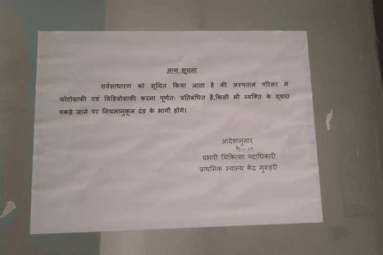 Muzaffarpur News: जिले के मुशहरी पीएचसी प्रभारी ने एक अजीबो-गरीब फरमान जारी किया है। उन्होंने अस्पताल परिसर में किसी भी तरह की फोटोग्राफी और वीडियोग्राफी को प्रतिबंधित करने का निर्देश देते हुए नोटिस जारी किया है। नोटिस में यह भी लिखा है कि यदि कोई व्यक्ति इस नियम का उल्लंघन करते पकड़ा जाता है तो उसके खिलाफ कार्रवाई की जाएगी। पीएचसी प्रभारी के इस तरह के निर्देश के बाद लोगों में हैरानी है। बता दें, बीते दिनों मुशहरी पीएचसी का एक वीडियो वायरल हुआ था जिसमें डॉक्टर की अनुपस्थिति में गार्ड द्वारा घायल व्यक्ति का इलाज किया जा रहा था। वीडियो सोशल मीडिया पर जमकर वायरल हुआ था।