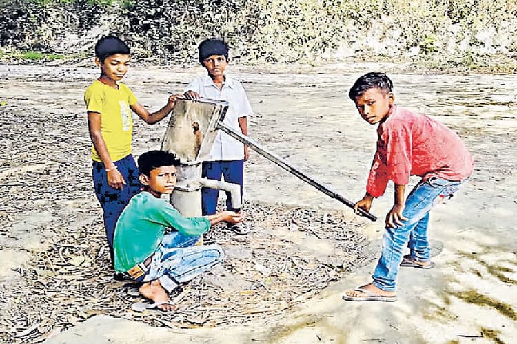 घूंट-घूंट पानी पीकर गले को तर करते हैं बच्चे