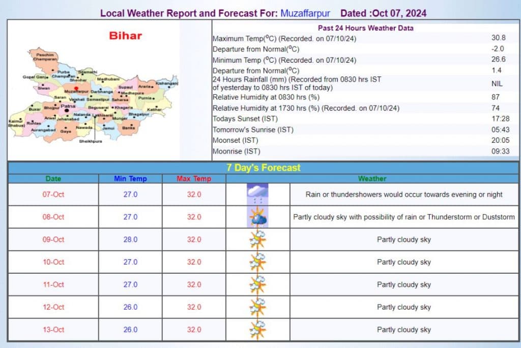 Muzaffarpur Weather: जानिए नवरात्रि के छठे दिन कैसा रहेगा मौसम का मिजाज, IMD ने जारी किया अपडेट