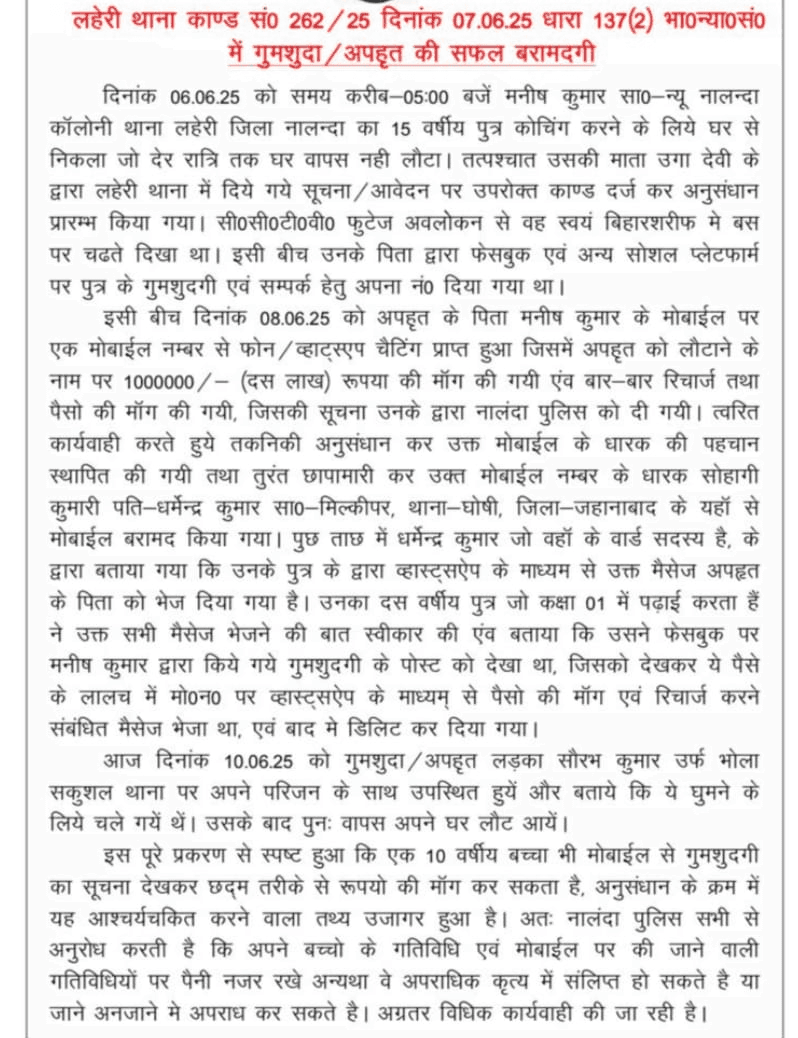 Nalanda News, सुनील कुमार: नालंदा के लहेरी थाना क्षेत्र में एक चौंकाने वाला मामला सामने आया है, जहां एक 10 वर्षीय बालक ने सोशल मीडिया पर गुमशुदगी की सूचना देखकर फिरौती की मांग कर डाली. पुलिस की तत्परता से गुमशुदा किशोर सकुशल बरामद कर लिया गया है और पूरे मामले का पर्दाफाश किया. जानकारी के मुताबिक 6 जून को शाम करीब 5:00 बजे न्यू नालंदा कॉलोनी निवासी मनीष कुमार का 15 वर्षीय पुत्र सौरभ कुमार उर्फ भोला कोचिंग के लिए घर से निकला था, लेकिन देर रात तक वापस नहीं लौटा. परिजनों द्वारा खोजबीन के बाद उसकी मां उगा देवी के आवेदन पर लहेरी थाना कांड सं. 262/25 धारा 137(2) भा.दं.वि. के तहत मामला दर्ज किया गया.