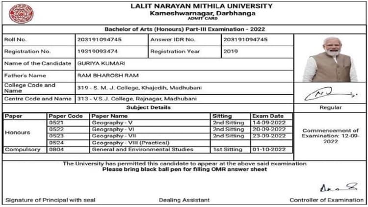 महेंद्र सिंह धोनी की तस्वीर वाला एडमिट कार्डनरेंद्र मोदी की तस्वीर और हस्ताक्षर वाला प्रवेश पत्र एसएमजे कॉलेज खाजेडीह, मधुबनी की गुड़िया कुमारी के नाम है. वह भूगोल प्रतिष्ठा की परीक्षार्थी हैं. जिनका रोल नंबर 203191094745 है. वहीं महेंद्र सिंह धोनी की तस्वीर वाला एडमिट कार्ड आरबी कॉलेज दलसिंहसराय के बबलू कुमार के नाम है जो दर्शनशास्त्र का छात्र है. परीक्षा क्रमांक 204061115485 है.