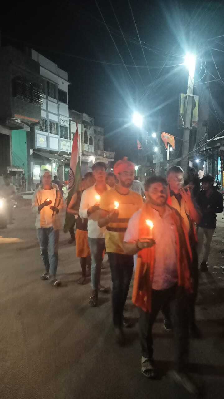 मारे गये पर्यटकों को दी गयी श्रद्धांजलि कौआकोल जेपी चौक से ब्लॉक गेट तक निकाला गया कैंडल मार्च फोटो – कैप्शन -तिरंगे के साथ कैंडल मार्च निकालते लोग. प्रतिनिधि, कौआकोल जम्मू कश्मीर के पहलगाम में हुए कायरतापूर्ण आतंकी हमला में मौत के शिकार हुए पर्यटकों की आत्मा की शांति के लिए शुक्रवार की शाम कौआकोल जेपी चौक पर श्रद्धांजलि सभा का आयोजन किया गया है, इसके पूर्व कौआकोल जेपी चौक से ब्लॉक गेट तक कैंडल मार्च भी निकाला गया, विहिप,बजरंग दल,भाजपा एवं अन्य हिन्दू संगठनों के द्वारा आयोजित श्रद्धांजलि सभा एवं कैंडल मार्च में लोगों ने दो मिनट का मौन रखकर मृतकों की आत्मा की शांति के लिए ईश्वर से प्रार्थना की है, इस दौरान लोगों में पाकिस्तान एवं उसके पोषित आतंकियों के प्रति काफी गुस्सा झलक रहा था, लोगों ने आतंकियों द्वारा किये गए इस कायराना हमला की निंदा करते हुए पीएम मोदी से कठोर कार्रवाई करने की मांग की है, मौके पर बजरंग दल के मुकेश कुमार,अभिमन्यु सिंह,राहुल शुक्ला,बालमुकुंद सिंह, सूरज साहू सहित सैकड़ों लोग मौजूद थे,