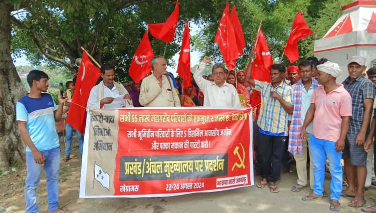 अकबरपुर. भाकपा-माले की अकबरपुर प्रखंड कमेटी के बैनर तले पांती काली मंडा से सैकड़ों किसान, मजदूर, महिलाएं व छात्र-नौजवान ने अकबरपुर ब्लॉक पर पहुंचकर प्रदर्शन किया. ””हक दो, वादा निभाओ”” अभियान के तहत 95 लाख अत्यंत गरीब परिवारों को दो लाख रुपये की सहायता राशि के लिए 72 हजार रुपये से कम का आय प्रमाण-पत्र बनाने, भूमिहीन परिवारों को पांच डिसमिल आवासीय जमीन देने, सबको पक्का मकान व 200 यूनिट मुफ्त बिजली देने, मनरेगा में लूट-खसोट व फर्जी निकासी पर रोक लगाने, मजदूरों को 200 दिन काम व 600 रुपये दैनिक मजदूरी देने, आंगनबाड़ी व राशन-किरासन वितरण में गड़बड़ी पर रोक लगाने सहित अन्य मांगों को लेकर प्रतिनिधिमंडल, सीओ कार्यालय को अवगत कराया. वक्ताओं ने कहा जब महागठबंधन की सरकार थी, तो जातीय गणना करायी गयी. इसमें पाया गया कि राज्य में 34 प्रतिशत लोग बेहद गरीब हैं, जिनको सरकार ने दो लाख रुपये रोजगार के लिए देने का वादा किया. लेकिन, आज उसमें आय प्रमाणपत्र के नाम पर टालमटोल कर रहा है. भाकपा माले ने शनिवार को कई मांगों को ले माले के बैनर तले कई गांवों से पहुंचे सैकड़ों किसान मजदूर, महिलाएं, छात्र नौजवानों ने प्रखंड कार्यालय पर धरना- प्रदर्शन किया. सभी किसान मजदूर, महिलाएं व नौजवानों ने पांती काली मंडा से मार्च निकाला और अकबरपुर प्रखंड मुख्यालय पर जाकर प्रदर्शन किया. अंचलाधिकारी ने प्रदर्शन कर रहे लोगों से मांगा पत्र लेकर समुचित मांग पूरा करने का आश्वासन दिया. भाकपा माले राज्य कमेटी के सदस्य नरेंद्र सिंह, सचिव सुरेंद्रनाथ गोस्वामी, जिला कमेटी के सदस्य रमेश पासवान, उर्मिला देवी, कृष्ण रविदास, गजाधर मांझी, ब्रह्मदेव राजवंशी आदि बड़ी संख्या में भाकपा वाले से जुड़े लोग शामिल थे.