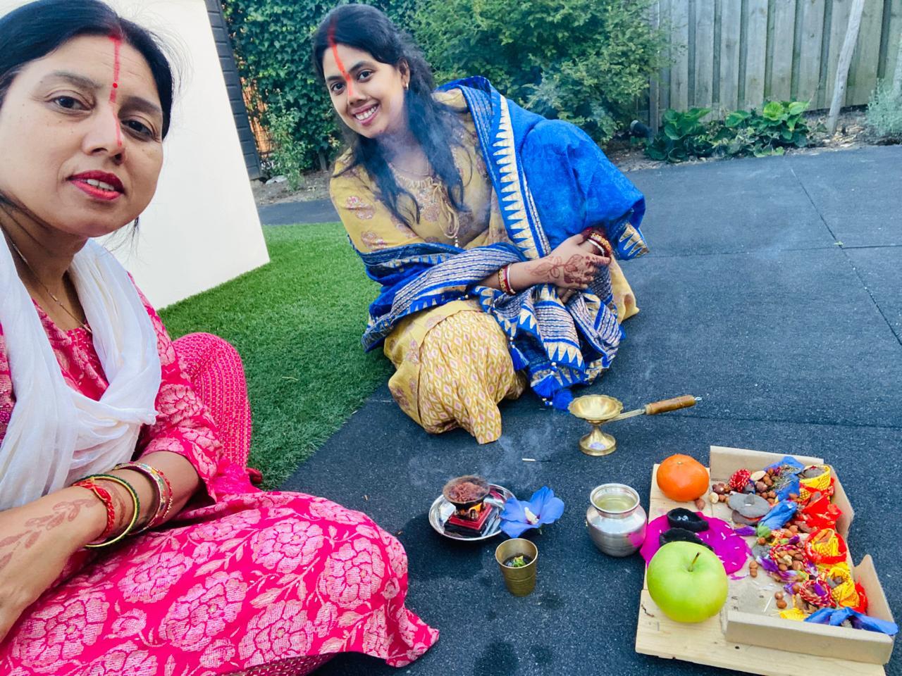 विदेश में रहकर अमोला देश के हर पर्व-त्योहार को उत्सव पूर्वक मनाती हैंफोटो- नीदरलैंड्स में तीज करतीं अमोला और उनकी मां प्रियंका.