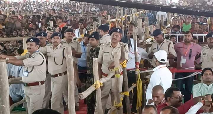 प्रधानमंत्री नरेंद्र मोदी की चुनावी सभा को लेकर जिले में सुरक्षा की अभूतपूर्व व्यवस्था की गयी थी. पीएम की लोकप्रियता को ध्यान में रखते हुए सुरक्षा व्यवस्था को और अभेद्य बनाया गया था. सुरक्षा प्रोटोकॉल के तहत शहरी क्षेत्र में प्रवेश के लगभग पांच किलोमीटर पहले से ही चारों तरफ फोर्स की तैनाती की गयी थी. एनएसजी कमांडो के नेतृत्व में मंच के आसपास की सुरक्षा व्यवस्था बनायी गयी थी. चप्पे-चप्पे पर पुलिस फोर्स तैनात किये गये थे. मुख्य सभास्थल में प्रवेश के लिए दर्जनभर से अधिक मेटल डिटेक्टर मशीन लगायी गयी थी. जहां पर बड़ी संख्या में पुलिस पदाधिकारी और जवानों के नेतृत्व में लोगों की जांच की गयी. इसके बाद प्रवेश दिलाया गया. जिला प्रशासन के सभी अधिकारी चौकन्ना रहकर सुरक्षा व्यवस्था की कमान संभालते दिखे. लोगों की बढ़ती हुई भीड़ के बावजूद सारी व्यवस्थाओं को संभालने के लिए पुलिस बल और मजिस्ट्रेट पूरी मुस्तैदी के साथ अपने तैनात किये गये मोर्चे पर डटे दिखे.