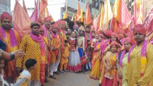 वारिसलीगंज. शहर के गुमटी रोड स्थित दुर्गा मंदिर से रविवार को श्री श्याम फाल्गुन महोत्सव पर मारवाड़ी समाज के लोगों ने भव्य निशान शोभायात्रा निकाली. निशान शोभायात्रा को लेकर शहर में उत्सवी माहौल रहा. निशान शोभायात्रा गुमटी रोड से निकलकर मेन चौक होते हुए मेन रोड, उत्तर बाजार, पुरानी बैंक रोड, थाना चौक, आंबेडकर चौक, शहीद चंदन सिंह चौक से गुजरकर डाकघर के समीप समापन हुआ. जहां बाबा खाटू श्याम जी की भव्य आरती की गयी. शोभायात्रा के दौरान महिला व पुरुष श्रद्धालु हाथों में निशान लेकर ढोल-नगाड़ों के साथ भक्ति गीतों पर नाचते-गाते चल रहे थे. शोभायात्रा में शामिल श्रद्धालुओं द्वारा सड़कों पर रंग-गुलाल उड़ाया गया. फूलों की बारिश की गयी. भक्ति गीत पर श्रद्धालु थिरकते नजर आये. वहीं, कलाकारों का नृत्य ने समां बांध दिया .कलाकारों ने ब्रज की होली गीत पर बेहतरीन नृत्य किया. इन कलाकारों ने ऐसा प्रदर्शन किया, मानो वारिसलीगंज की सड़कों पर ब्रज की होली खेली जा रही हो. निशान शोभायात्रा शहर के अधिकांश मार्गों से होकर गुजरी. इस दौरान समाज सेवियों की ओर से निशान यात्रा वाले मार्ग में जगह-जगह ठंडा पानी व शरबत का स्टॉल लगाया गया था. श्रद्धालुओं को फल और जूस से स्वागत किया गया. वहीं, रंग और गुलाल लगाकर खुशी का इजहार किया गया. संध्या आरती के बाद सांस्कृतिक कार्यक्रम फाल्गुन महोत्सव पर पिछले कई वर्षों से मारवाड़ी समाज के लोगों ने निशान शोभायात्रा निकाली जा रही है. रविवार सुबह निशान शोभायात्रा निकलने के बाद दिनभर पूजा अर्चना का दौर चलता रहा. वहीं, संध्या में कलाकारों ने सांस्कृतिक कार्यक्रम पेश किया. साथ ही भंडारा का आयोजन किया गया. इसमें श्रद्धालुओं ने प्रसाद ग्रहण किया. मौके पर मनीष कमलिया, पवन बंका, संजय जालान, कन्हैया कुमार, पंकज शर्मा, दिनेश सुल्तानिया, रोहित कुमार, अंकित कुमार, पल्लवी कुमारी, आम्रपाली कुमारी, अनिता देवी, सोनु कुमार सहित सैकड़ों लोग मौजूद थे.