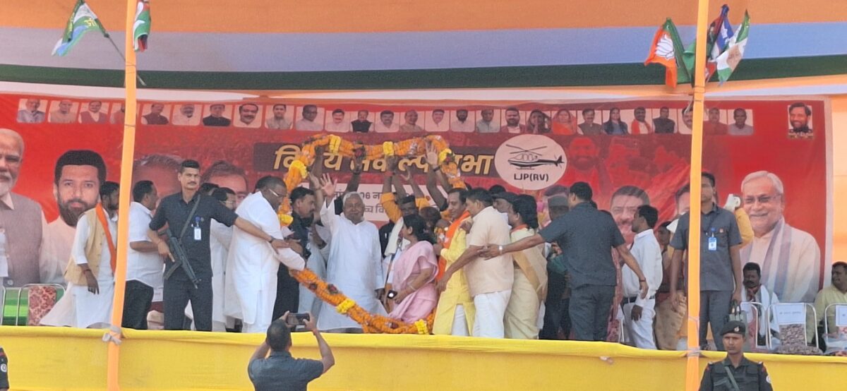 प्रतिनिधि, मेसकौर/ नवादा सदररजौली विधानसभा क्षेत्र के मेसकौर के बीजूबीघा स्थित केशोराम इंटर विद्यालय के मैदान में मुख्यमंत्री नीतीश कुमार ने एनडीए प्रत्याशी (लोजपा रा) के विमल राजवंशी के समर्थन में हुंकार भरते हुए उपस्थित जनसमूह से उन्हें भारी मतों से विजयी बनाने की अपील की. साथ ही नवादा से विभा देवी, हिसुआ से अनिल सिंह, वारसलीगंज से अरुणा देवी व गोविंदपुर से विनिता मेहता को भी जिताने की मांग जनता से की. मुख्यमंत्री ने कहा कि हमारी सरकार अगले पांच वर्षों में एक करोड़ युवाओं को रोजगार और नौकरी के अवसर देगी. बिहार के युवाओं का भविष्य सुरक्षित और सशक्त बनाना ही हमारी प्राथमिकता है. इस दौरान उन्होंने कहा कि पूर्ववर्ती शासनकाल को कटघरे में खड़ा करते हुए कहा कि उस समय सत्ता केवल परिवार तक सीमित थी, जनता के विकास से किसी को कोई सरोकार नहीं था. लगभग आधे घंटे के संबोधन में विकास, सुशासन और सामाजिक न्याय के मुद्दों को केंद्र में रखा. विपक्ष पर तीखा प्रहार करते हुए मुख्यमंत्री ने कहा कि 2005 से पहले बिहार अंधकार, भय और अपराध का पर्याय था. न बिजली थी, न सड़कें, न अस्पताल, न पानी की सुविधा. उस दौर में शाम ढलते ही लोग घरों से बाहर निकलने से डरते थे. हमने जंगलराज से बिहार को बाहर ला कर कानून का राज स्थापित किया, विकास का नया अध्याय लिखा.