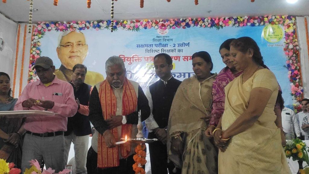 जिला प्रभारी मंत्री के अलावा अन्य अतिथि नियुक्ति पत्र वितरण के दौरान रहे मौजूद मंत्री- सरकार शिक्षा को दे रही बढ़ावा सीएम के पटना में नियुक्ति पत्र कार्यक्रम का सीधा प्रसारण प्रसारित किया गया फोटो कैप्शन- – विशिष्ट शिक्षक को नियुक्ति पत्र देते मंत्री. प्रतिनिधि, नवादा कार्यालय बिहार विद्यालय परीक्षा समिति द्वारा चयनित, सक्षमता परीक्षा-2 उत्तीर्ण विशिष्ट शिक्षकों को मुख्यमंत्री नीतीश कुमार के द्वारा नियुक्ति पत्र वितरण समारोह कार्यक्रम का लाइव टेलीकास्ट किया गया. जिले में इस कार्यक्रम के लिए अतिथि के रूप में जिला प्रभारी मंत्री डॉ प्रेम कुमार मौजूद रहे. डीएम रवि प्रकाश ने मंत्री को पौधा देकर स्वागत किया. सहकारिता व पर्यावरण विभाग के मंत्री सह जिला प्रभारी मंत्री प्रेम कुमार, अन्य जन प्रतिनिधियों व डीएम रवि प्रकाश ने दीप प्रज्वलित कर उद्घाटन किया. मंत्री ने कहा कि उत्तीर्ण सभी विशिष्ट शिक्षक बिहार विद्यालय परीक्षा समिति की सक्षमता परीक्षा के माध्यम से चयनित होकर आये हैं. उन्होंने कहा कि आपने कठिन मेहनत और समर्पण भाव से सक्षमता परीक्षा पास की है. बच्चों को संवारने और उन्हें दक्ष बनाने में आप लगे हैं. उम्मीद है कि आप उसी समर्पण भाव से बच्चों को संवारने में अहम भूमिका निभायेंगे. हमें आशा ही नहीं पूर्ण विश्वास है कि आप विषय के साथ बिहार के नौनिहालों को जीवन का मूल्यवान पाठ पढ़ायेंगे और आपने मार्गदर्शन से बेहतर इंसान बनाने में मदद करेंगे. उन्होंने कहा कि पूरे बिहार में बिहार विद्यालय परीक्षा समिति से आयोजित सक्षमता परीक्षा-1 में एक लाख 39 हजार व्यक्तियों को विशिष्ट शिक्षक के रूप में औपबंधिक नियुक्ति पत्र दिया गया है. पुनः सक्षमता परीक्षा-2 में 59028 शिक्षकों को विशिष्ट शिक्षक के रूप में औपबंधिक नियुक्ति पत्र दिया जा रहा है. नवनियुक्त विशिष्ट शिक्षकों की जिम्मेदारी है कि बच्चों को शैक्षणिक गुणवता प्रदान करने के साथ-साथ सृजनात्मक व रचनात्मक कार्यों से जोड़कर बच्चों के सर्वागींण विकास में अहम भूमिका निभाएं. सभी कोटि के स्कूलों में हुई नियुक्ति मंत्री डॉ प्रेम कुमार ने बताया कि नवादा जिलांतर्गत शिक्षा विभाग की ओर से विभिन्न कोटियों के शिक्षकों की नियुक्ति हुई है. नवादा जिले में वर्ग 1-5 में 930 विद्यालय, वर्ग 1-8 में 696 विद्यालय व वर्ग 9-12 में 207 विद्यालय कुल मिलाकर वर्तमान में 1833 विद्यालय संचालित हैं. नवादा जिला अंतर्गत बिहार विद्यालय परीक्षा समिति के माध्यम से सक्षमता-1 के तहत पूर्व में 3900 शिक्षकों को सक्षमता परीक्षा उत्तीर्ण कर विशिष्ट शिक्षक के रूप नियुक्ति की गयी. पुनः सक्षमता-2 के तहत वर्ग 1-5 में 773 तथा वर्ग 6-8 में 71 तथा वर्ग 9-10 में 65 एवं वर्ग 11-12 में 12 कुल 921 शिक्षकों को सक्षमता परीक