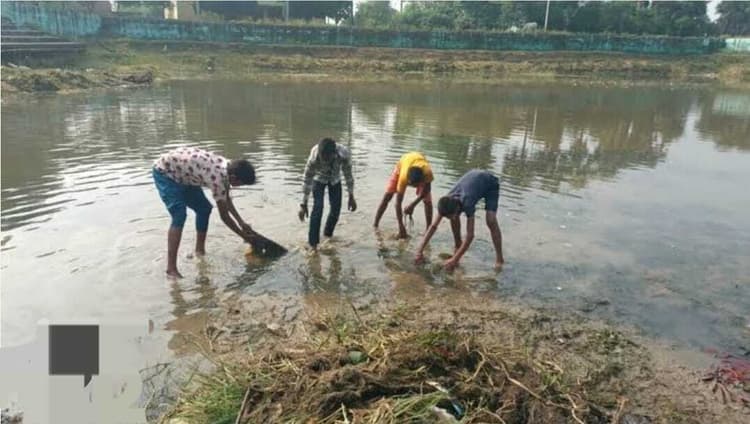 कैप्शन – छठ घाटों का जायजा लेते बीडीओ अश्विनी कुमार – तालाब की सफाई करते युवक