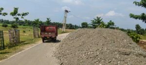 सड़क पर डंप बालू व गिट्टी से लोगों को आवागमन में हो रही परेशानी
