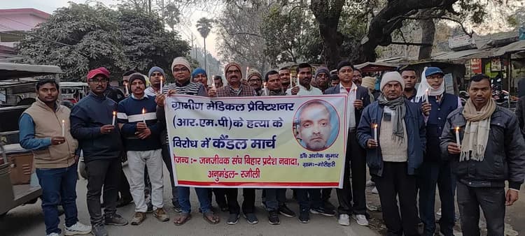 रोह प्रखंड में एक सप्ताह पूर्व ग्रामीण चिकित्सक निर्मल की नृशंस हत्या के विरोध में रविवार को रजौली प्रखंड में ग्रामीण चिकित्सकों ने कैंडल मार्च निकालकर प्रशासन के खिलाफ आक्रोश व्यक्त किया. कैंडल मार्च का नेतृत्व बिहार प्रदेश ग्रामीण चिकित्सक संघ के अध्यक्ष डॉ विपिन कुमार और रजौली प्रखंड अध्यक्ष डॉ जनार्दन प्रसाद ने किया. इस दौरान डॉ विपिन कुमार ने कहा कि यदि एक सप्ताह के भीतर हत्यारों की गिरफ्तारी नहीं हुई, तो पूरे बिहार में ग्रामीण चिकित्सक हड़ताल पर चले जायेंगे, जिसकी पूरी जिम्मेदारी सरकार और जिला प्रशासन की होगी. ग्रामीण चिकित्सकों ने कहा कि कोरोना काल में जब बड़े-बड़े अस्पताल और डॉक्टर पीछे हट गये थे, तब यही ग्रामीण चिकित्सक गांव-गांव जाकर लोगों की जान बचा रहे थे. आज वही सेवा देने वाले चिकित्सक असुरक्षित महसूस कर रहे हैं. कैंडल मार्च के माध्यम से दोषियों की अविलंब गिरफ्तारी और ग्रामीण चिकित्सकों की सुरक्षा की मांग की गयी. इस मौके पर ग्रामीण चिकित्सक संघ के अखिलेश कुमार, लालू प्रसाद, अजय सिंह, दीपांकर कुमार, प्रमोद कुमार गुप्ता, रंजीत कुमार एवं विक्की कुमार समेत दर्जनों ग्रामीण चिकित्सक शामिल हुए.