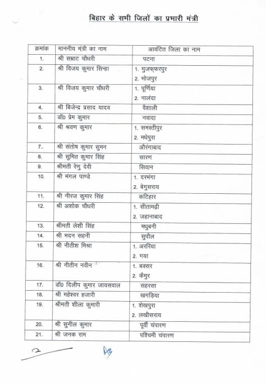 बिहार में 20 मंत्रियों को एक-एक जिले का प्रभारी मंत्री बनाया गया है. सम्राट चौधरी को पटना जिले की जिम्मेवारी मिली है. बिजेंद्र प्रसाद यादव वैशाली, प्रेम कुमार नवादा, संतोष कुमार सुमन औरंगाबाद, सुमित कुमार सिंह सारण, रेणु देवी सिवान, नीरज कुमार सिंह कटिहार, लेशी सिंह मधुबनी, मदन सहनी सुपौल, दिलीप कुमार जायसवाल सहरसा, महेश्वर हजारी खगड़िया, सुनील कुमार पूर्वी चंपारण, जनक राम पश्चिमी चंपारण, हरी सहनी अरवल, कृष्णनंदन पासवान गोपालगंज, जयंत राज रोहतास, रत्नेश सदा जमुई, केदार प्रसाद गुप्ता मुंगेर, सुरेंद्र मेहता बांका और संतोष कुमार सिंह को भागलपुर का प्रभारी मंत्री बनाया गया है.