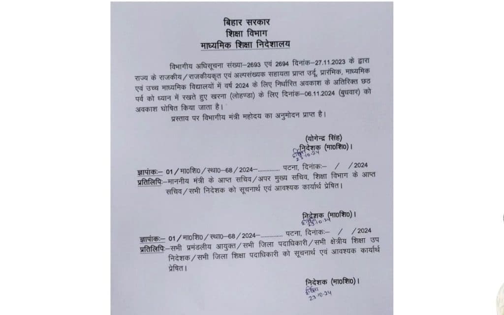 Chhath Puja Holiday : बिहार की नीतीश सरकार ने छठ्ठ पूजा के मौके पर खरना के दिन स्कूल बंद करने का आदेश जारी कर दिया है.