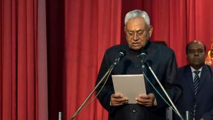 पटना. बिहार में एनडीए की सरकार बन गयी है. एनडीए के नेता के रूप में नीतीश कुमार बिहार के नये मुख्यमंत्री बने हैं. बिहार के राज्यपाल राजेंद्र आर्लेकर से नीतीश कुमार को मुख्यमंत्री पद की शपथ दिलायी. जदयू के राष्ट्रीय अध्यक्ष नीतीश कुमार नौवीं बार बिहार के मुख्यमंत्री पद की शपथ ली है. छठी बार नीतीश कुमार को मुख्यमंत्री पद के लिए भाजपा का समर्थन मिला है. नीतीश कुमार के बाद भाजपा के प्रदेश अध्यक्ष सम्राट चौधरी ने पद एंव गोपनीयता की शपथ ली. शपथ ग्रहण के दौरान जय श्रीराम और नीतीश कुमार जिंदाबाद के नारे लगते रहे. इस मौके पर भाजपा के राष्ट्रीय अध्यक्ष जेपी नड्डा, एनडीए के घटक दल के नेता चिराग पासवान और उपेंद्र कुशवाहा समेत कई लोग उपस्थित थे.