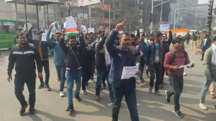 पटना में BTET-CTET पास अभ्यर्थियों ने डाक बंगाला चौराहा जाम किया. सातवीं चरण के बहाली की मांग को लेकर बड़ी संख्या में अभ्यर्थी सड़क पर उतर गए हैं. इससे यातायात पुलिस को ट्रैफिक डाइवर्ट करना पड़ रहा है. शिक्षक अभ्यर्थी अपनी मांगों को लेकर पिछले 38 दिनों से गर्दनीबाग में शांतिपूर्ण प्रदर्शन कर रहे थे. मगर सरकार के द्वारा सातवी चरण की बहाली का नोटिफिकेशन जारी नहीं करने पर आज विधानसभा के शीतकालीन सत्र के पहले दिन विधानसभा का घेराव करने निकले हैं. अभ्यर्थियों का कहना है कि वह पिछले 3 साल से प्रदर्शन कर रहे हैं. जिस पर उन्हें शिक्षा विभाग के द्वारा सिर्फ आश्वासन ही मिल रहा है. कुछ अभ्यर्थियों का आरोप है कि उन्हें रोकने के लिए डंडे भी चटकाए गए हैं.