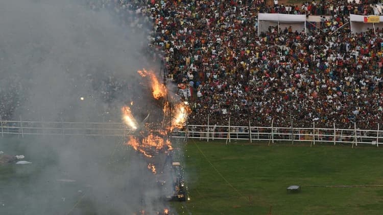 मुख्यमंत्री नीतीश कुमार ने रावण वध के लिए प्रतिक रूप से तीर चलाया. इसके बाद पुतलों में आग लगाई गयी.